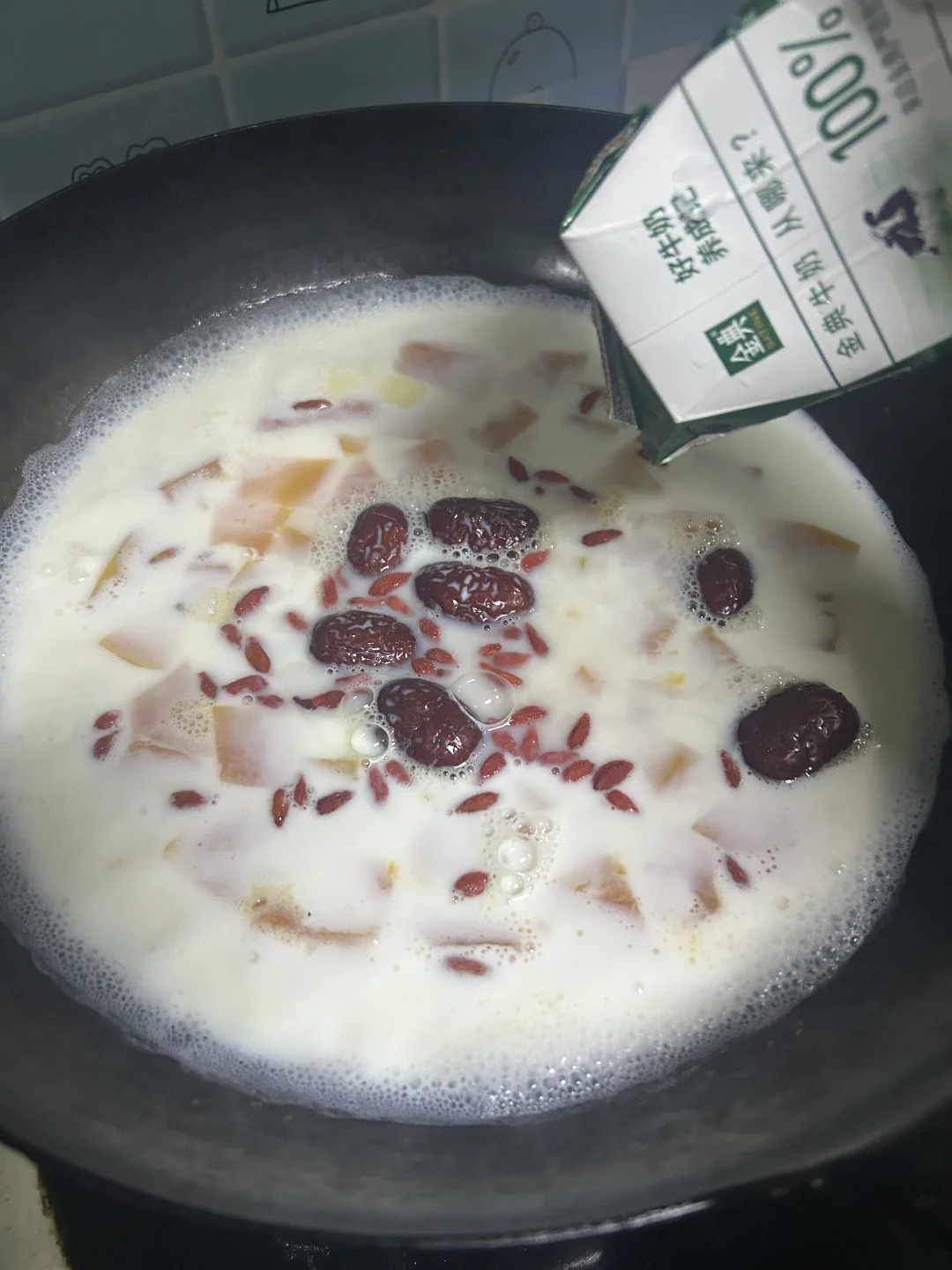 天气冷了,在家做一碗热气腾腾的甜品木瓜炖奶,家里有木瓜、牛奶就能做,不含科技,吃得放心,口感温润,清甜而不腻。 做法: 1. 准备食材:选择表皮橙黄、捏起来有一点软的成熟木瓜,洗净去皮,对半切开,用勺子刮去黑色木瓜籽,再切小块状。 2.锅里加清水,放入木瓜块,水量与木瓜齐平为宜,盖上盖子,水开后转小火炖煮约10分钟,至木瓜块变软。 3.倒入一盒250升纯牛奶,还可以加红枣,枸杞,搅拌均匀,小火继续炖煮5分钟。 4.喜欢吃甜味的加少许白糖或蜂蜜,搅拌融化。 自己做的甜品,成就感满满,都是好食材,吃得放心。