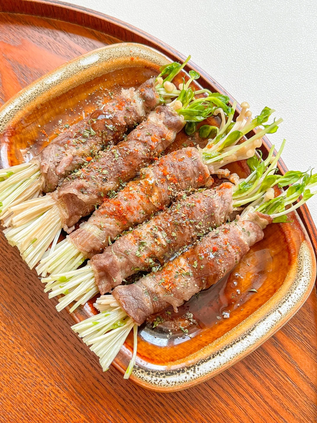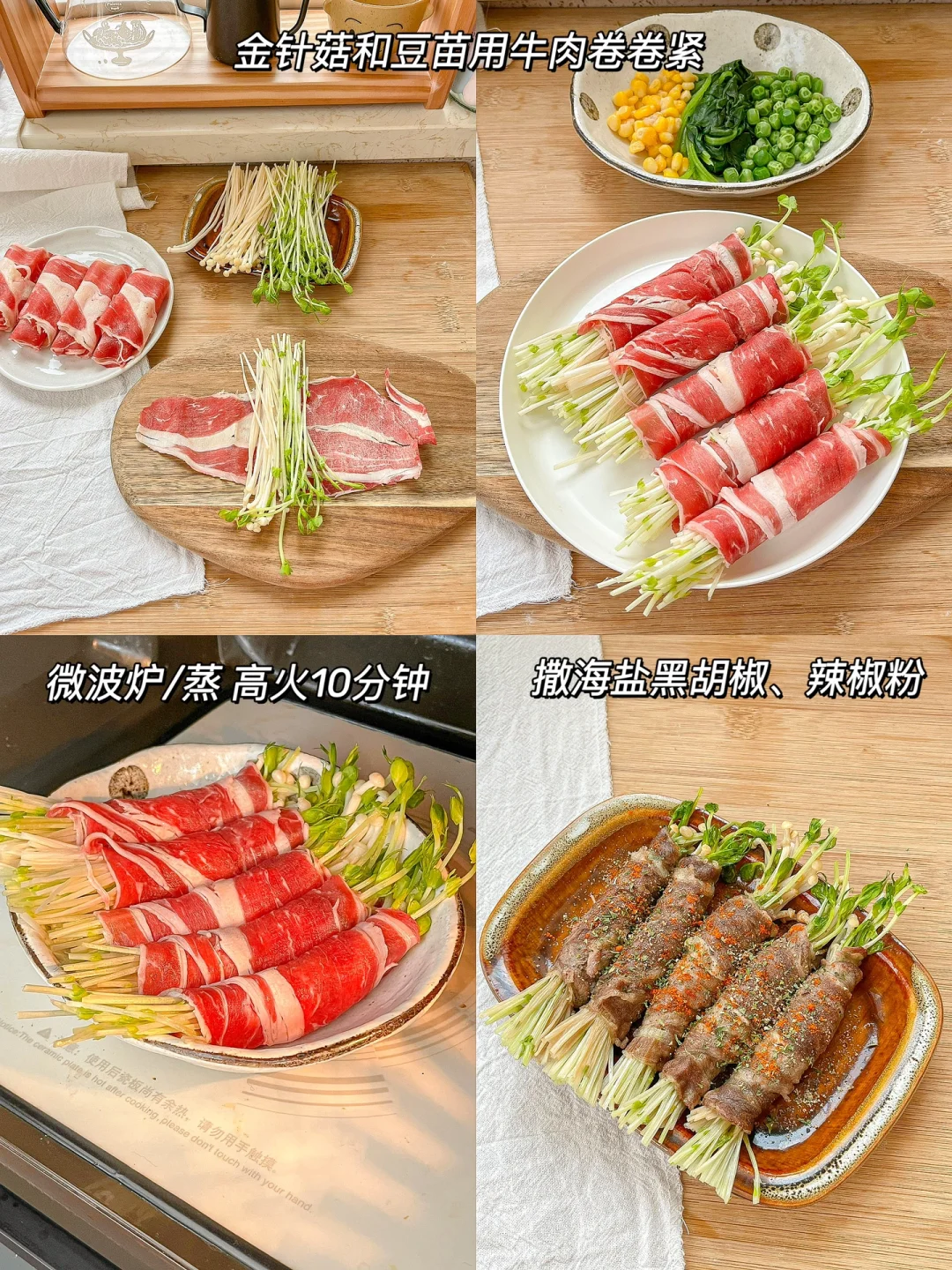 又是蔬菜和肉的完美组合,豆苗+金针菇+牛肉卷。做法就是卷卷卷,卷紧直接微波10分钟就行。出锅撒上喜欢的调味料就可以,我放了海盐黑胡椒和辣椒面。