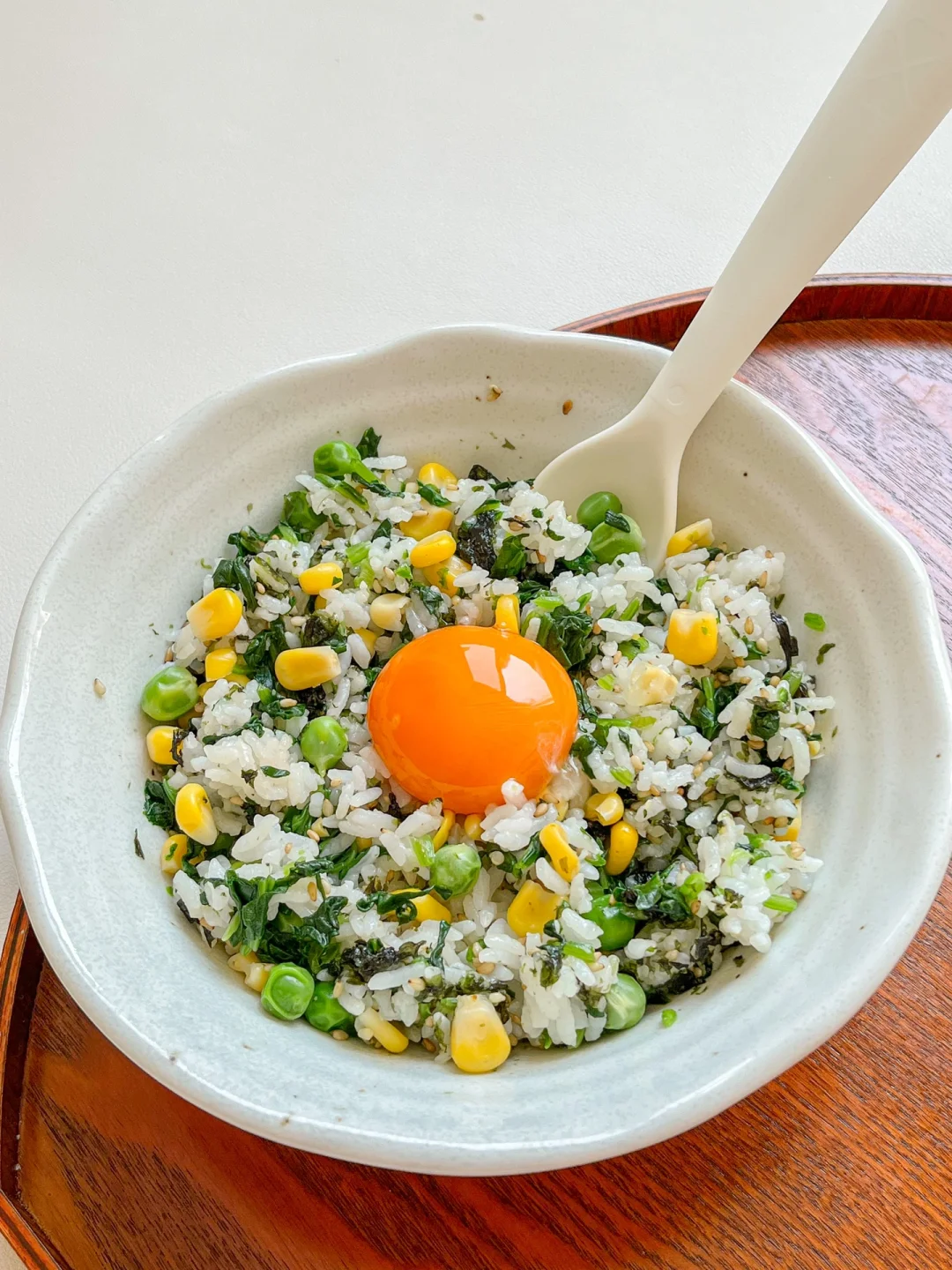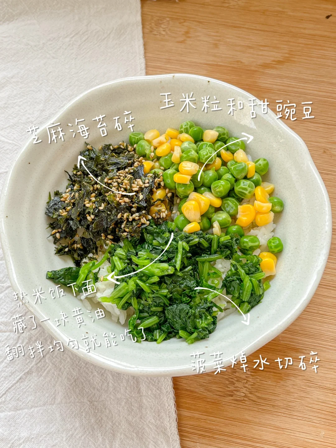 这个菠菜拌饭真的推荐!热乎乎的大米饭下面埋一颗黄油,没有的话猪油也可以,一小块就行。把菠菜焯水,攥干水分再切碎,加甜豌豆和玉米粒、芝麻海苔一起拌着吃。再来一点日式烤肉汁,好吃又满足!