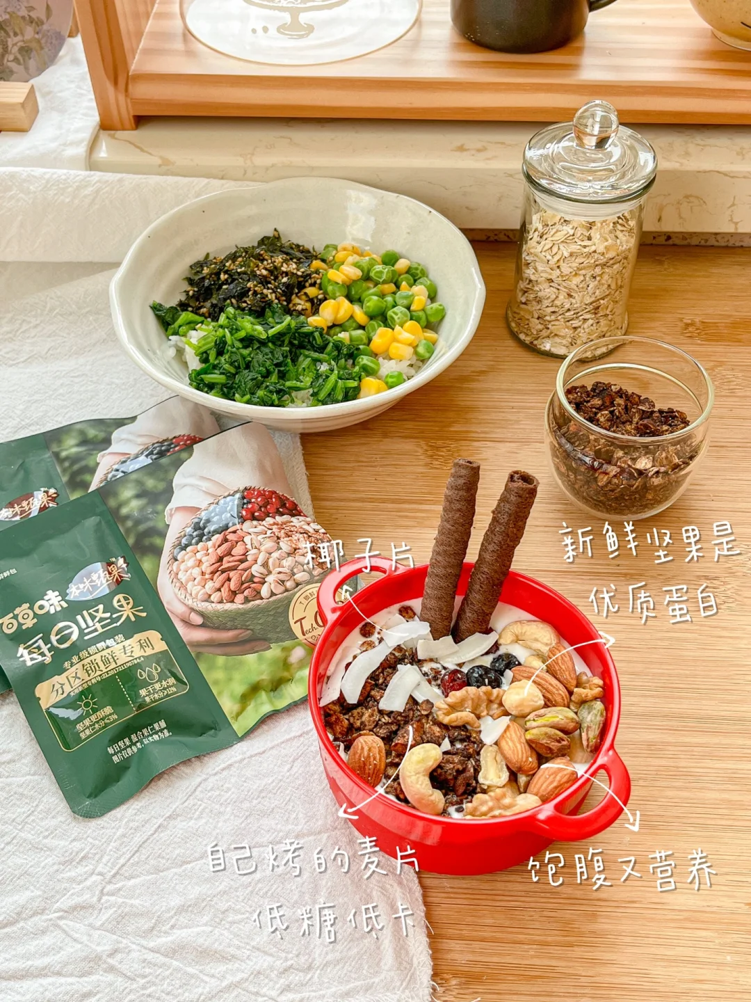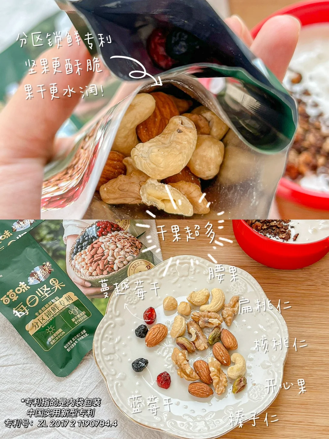 昨晚新做的无糖酸奶,来做一碗新鲜的坚果麦片酸奶碗。坚果直接用的百草味本味甄果每日坚果🌰,都是干净的大颗粒果仁。原味坚果,还有分区锁鲜专利,坚果更酥脆,果干更水润!这个包装可以防止坚果受潮影响口感,比普通的每日坚果口感好很多!下午加餐的时候也可以来一包,坚果都是优质脂肪,饱腹健康又方便~