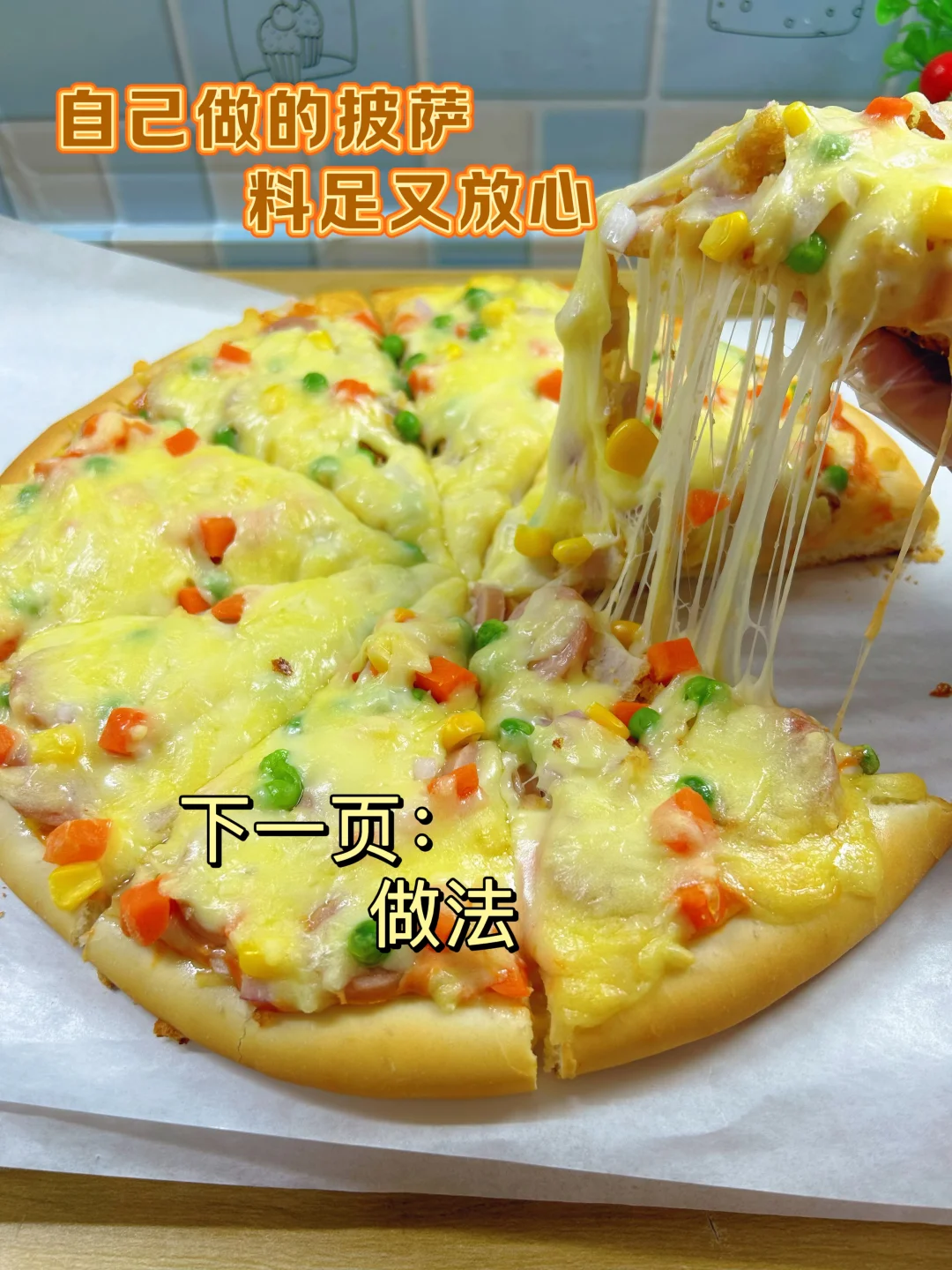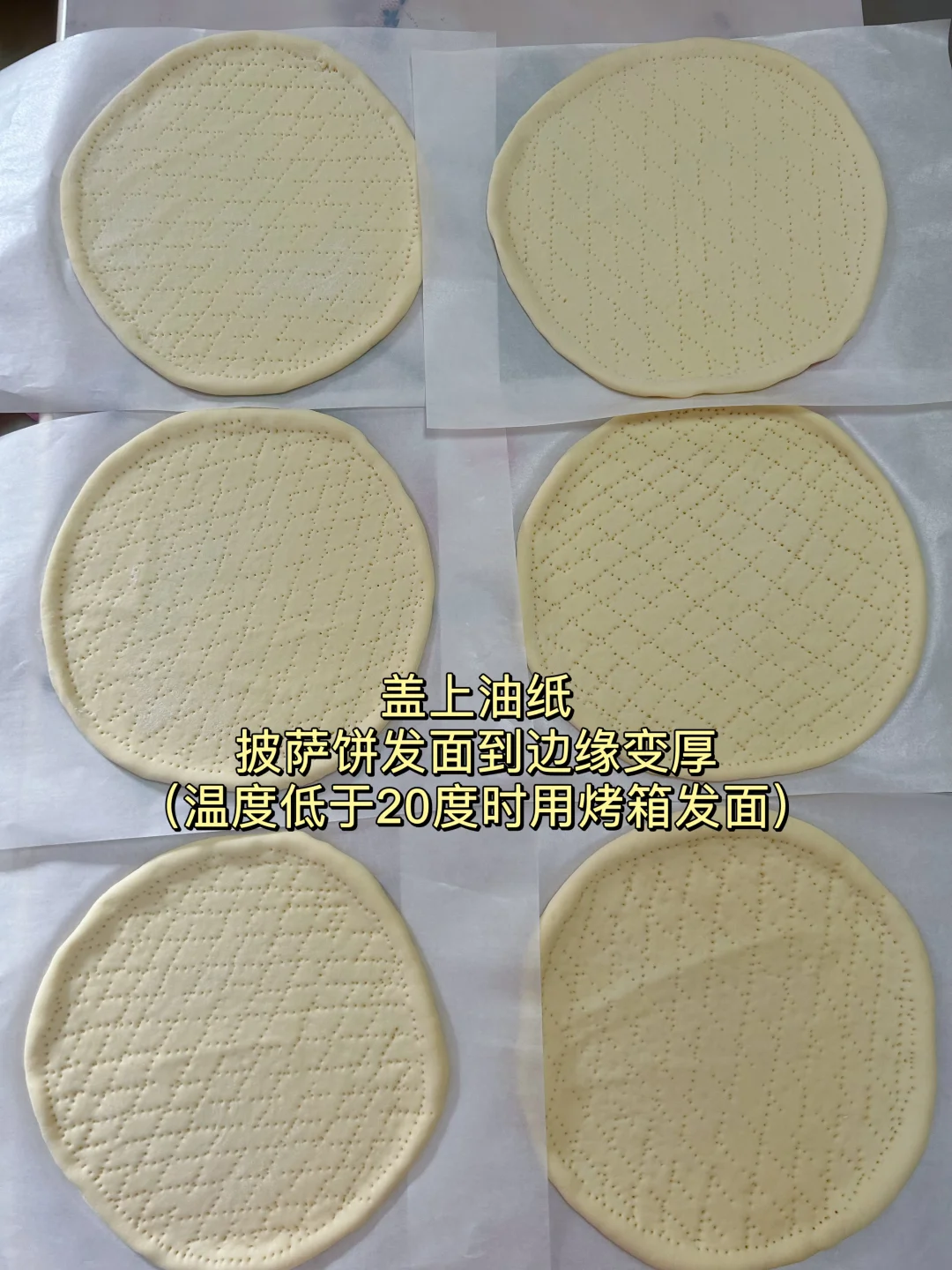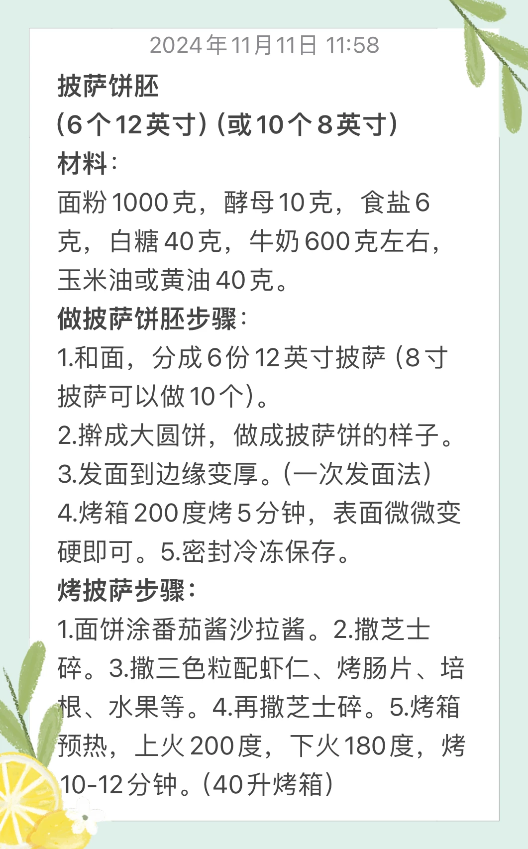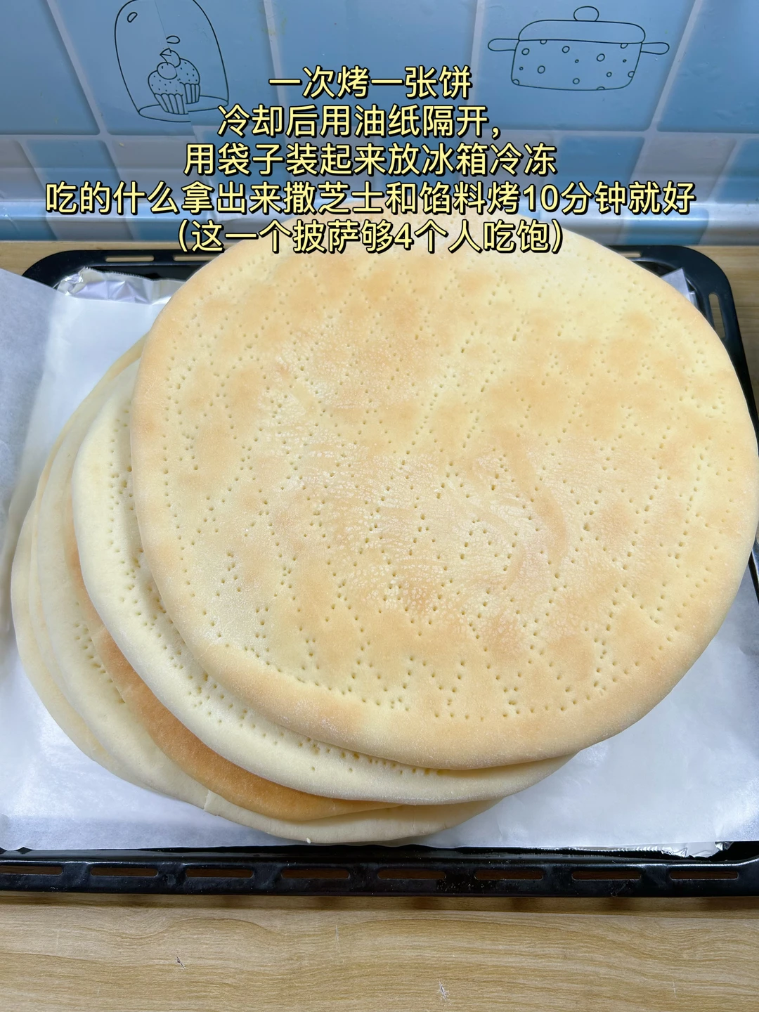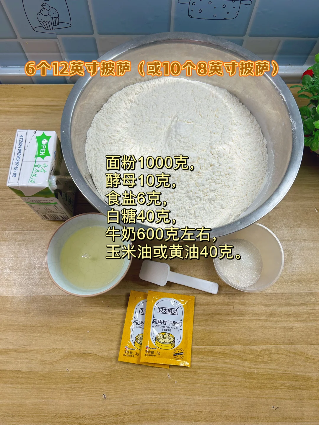 用了十年的披萨饼配方,每过一段时间我都会做一些披萨饼胚放冰箱冷冻,给家人做早餐。 披萨饼胚(6个12英寸)(或10个8英寸) 材料: 面粉1000克,酵母10克,食盐6克,白糖40克,牛奶600克左右,玉米油或黄油40克。 做披萨饼胚步骤: 1.和面,分成6份12英寸披萨(8寸披萨可以做10个)。 2.擀成大圆饼,做成披萨饼的样子。 3.发面到边缘变厚。(一次发面法) 4.烤箱200度烤5分钟,表面微微变硬即可。5.密封冷冻保存。 烤披萨步骤: 1.面饼涂番茄酱沙拉酱。2.撒芝士碎。3.撒三色粒配虾仁、烤肠片、培根、水果等。4.再撒芝士碎。5.烤箱预热,上火200度,下火180度,烤10-12分钟。(40升烤箱) 注意事项: 1.烤箱不同,温度时间略微不同,总之烤到表面微微变黄即可,看着一点。 2.有时间就用二次发面法,没时间就用一次发面法,发起来的才好吃。 3.如果烤的会鼓起来,就扎孔排气,就下去了。 4.如果当天做披萨,披萨饼可以不用烤,烤的目的是定型好收纳,避免压扁。 5.面团软并且经过发面的披萨饼才比较软。