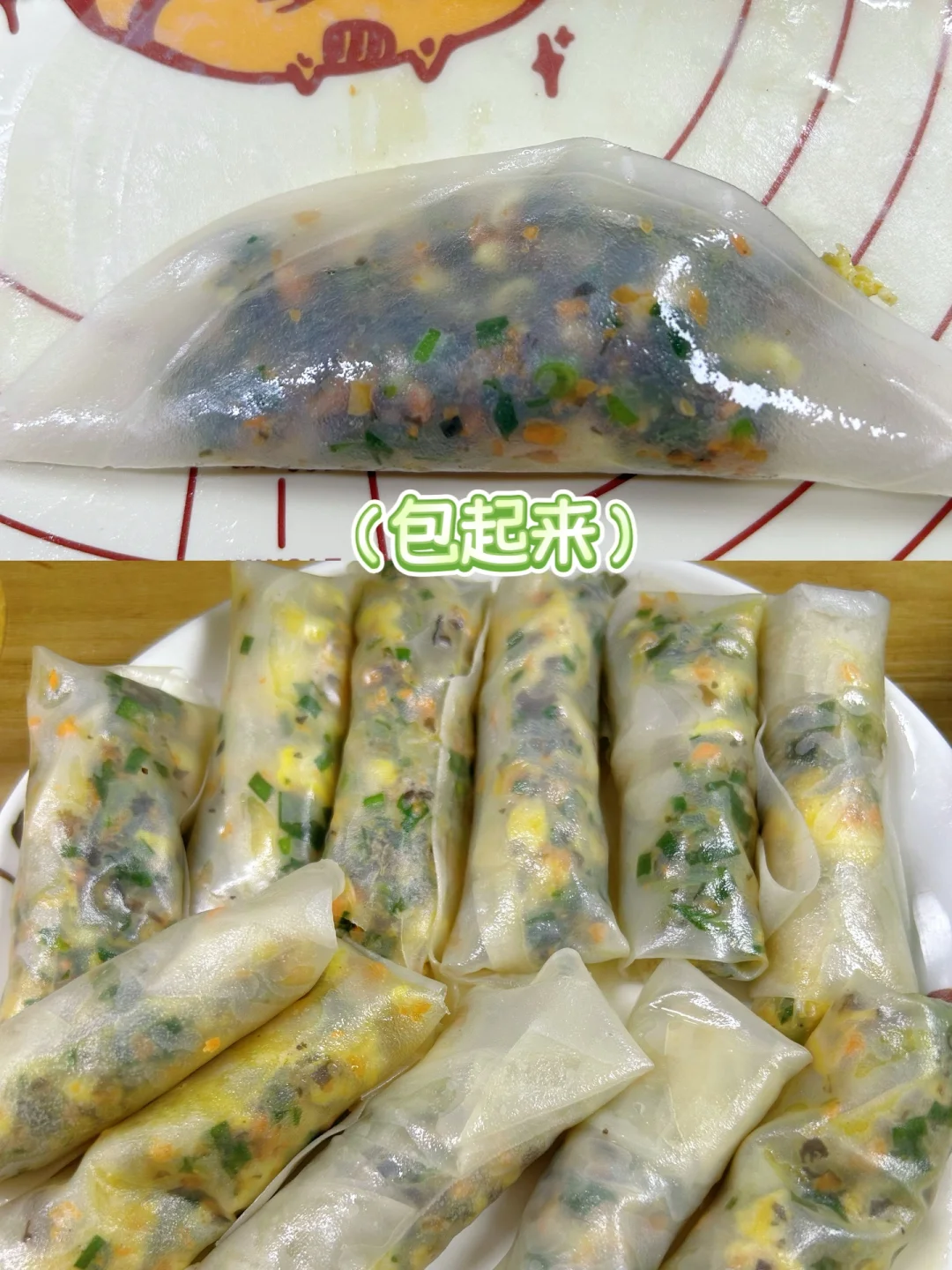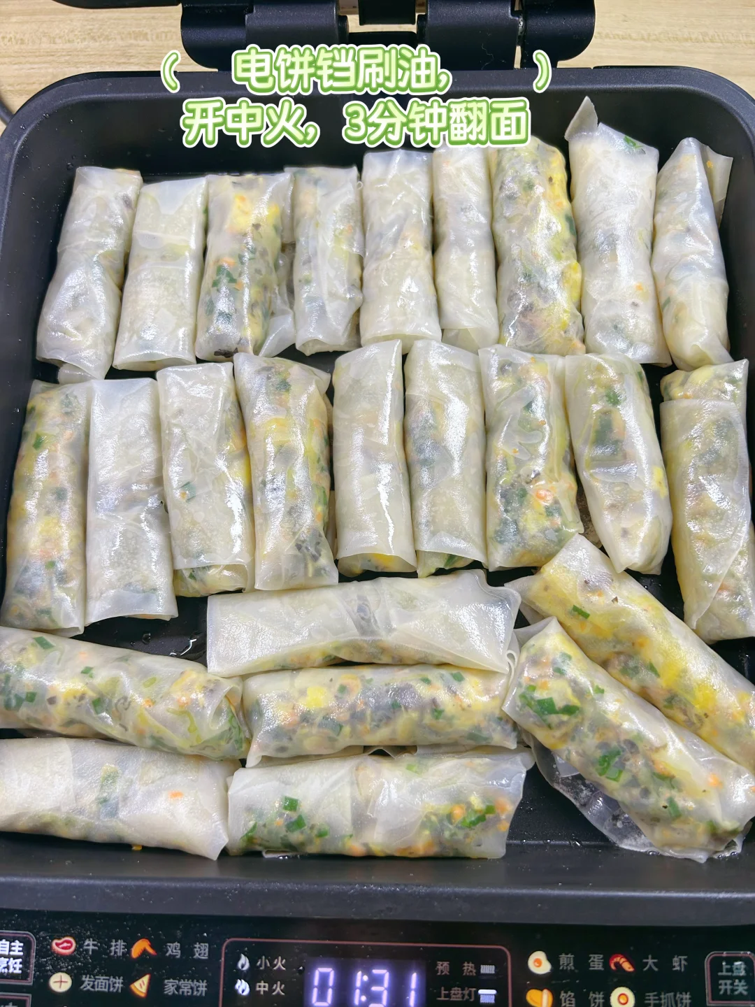 1.阳台上的花盆里栽了几颗韭菜,是去年十一回娘家从山上挖回来的,今年春天终于够一盘了,做个韭菜馅的春卷。 2.韭菜洗净切碎,加点油避免出水,加鸡蛋碎、胡萝卜碎、黑木耳碎、虾皮,调料放食盐、胡椒粉、蚝油等。 3.饺子皮是现成的,刷油,5张一叠,擀开,蒸5分钟。放至温热撕开。 4.包上馅料,电饼铛刷油预热后,调中火,放入韭菜春卷,盖上盖子,三分钟后翻面,两面金黄后出锅。