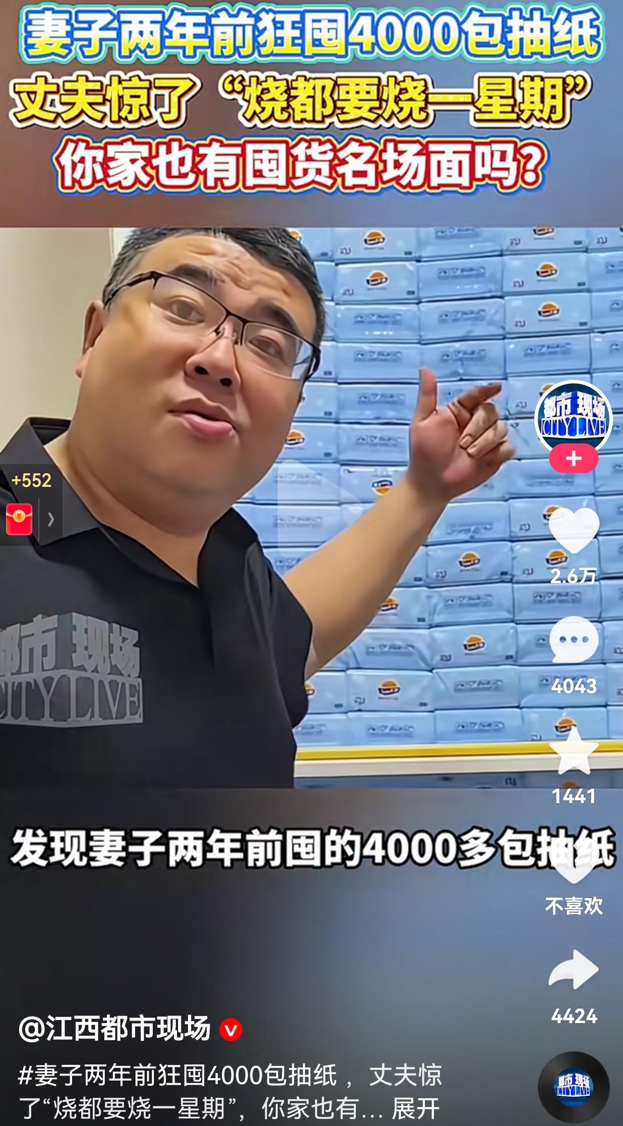 笑不活了!怎么这么爱囤货呢?近日,陕西西安,一男子打开家里柜门,直接看傻了。 为什么呢?因为,整面墙堆得满满当当的都是抽纸,男子一看消费记录,这不看不知道,一看吓一跳。 这些抽纸竟然是妻子在2023年囤的,足足🈶4000多包,如今两年时间过去,这些抽纸愣是没动多少。 男子无奈调侃:“这纸要是烧,都得烧一星期!” 此视频传到了网上,引发无数网友的热议,有的网友说:“4000包抽纸?这不是开玩笑吧?这是准备开超市吗?” 还有的网友说:“虽然离谱,但我理解她,毕竟6毛一包,那是真的很香!” 说真的,看到这面“抽纸墙”,我第一反应是笑,笑着笑着又觉得特别真实。 因为,她当初以不到6毛一包的价格买的,这事搁在谁的身上,都觉得是在“薅羊毛”。 毕竟现在超市里一包抽纸随便就要两三块,这价格确实香到让人忍不住下手。 不过话说回来,囤货也得有个度。虽然价格便宜,但占地方不说,万一放久了受潮变质,这不就得不偿失了吗? 最后想问一句:你家有没有囤货的名场面呢?评论区一起唠一唠。