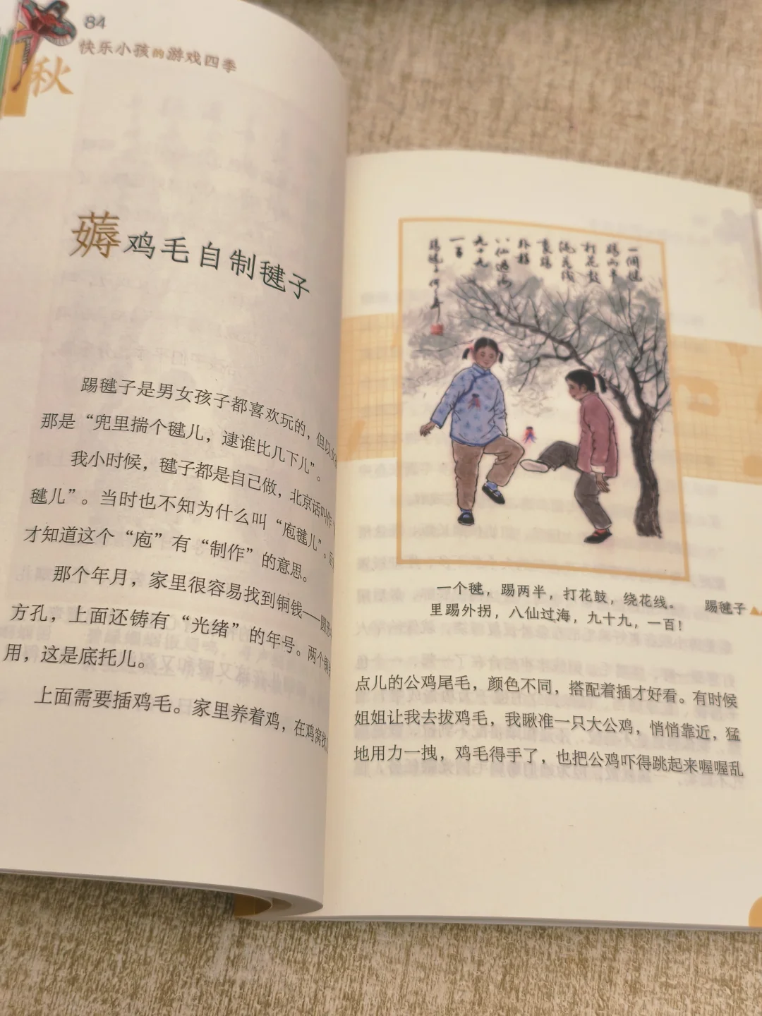 翻开书页的刹那,我11岁的儿子突然抬头问:“妈妈,你小时候也玩这些吗?”夕阳斜照进窗,他手指正停在何大齐《快乐小孩的游戏四季》里“滚铁环”的插图上。那根简陋的铁钩和飞驰的圆环,瞬间串起了两代人的童年。