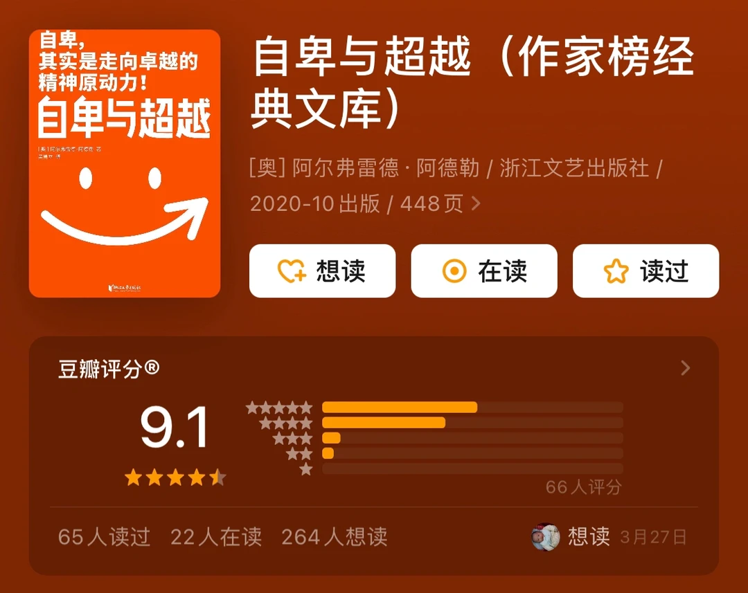 ✨这本书是作者阿德勒从个体心理学观点出发,阐明人生道路和人生意义的通俗性读物,同时又蕴含着极深的哲理和巨大的学术价值。作者在书中提出:我们生活在与他人的联系中,假如因自卑而将自己孤立,我们必将自取灭亡。我们必将超越自卑。