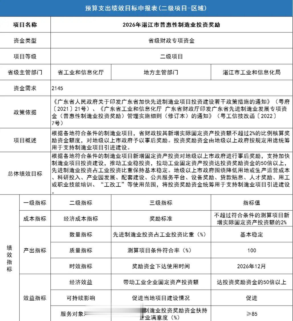 据悉,省财政按其申报期内新增实际固定资产投资额不超过2%的比例核算奖励资金额度,对地级以上市政府予以事后奖励,地级以上市政府围绕降低用地或生产运营成本、科研投入、产业园发展、配套建设、公共服务平台、设备奖励、贷款贴息、人才奖励、用工或职业技能培训、“工改工”等使用范围,将奖励资金统筹用于支持制造业项目引进建设。