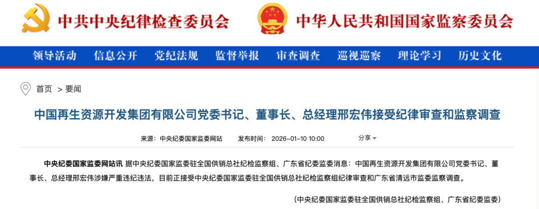 据中央纪委国家监委驻全国供销总社纪检监察组、广东省纪委监委消息:中国再生资源开发集团有限公司党委书记、董事长、总经理邢宏伟涉嫌严重违纪违法,目前正接受中央纪委国家监委驻全国供销总社纪检监察组纪律审查和广东省清远市监委监察调查。