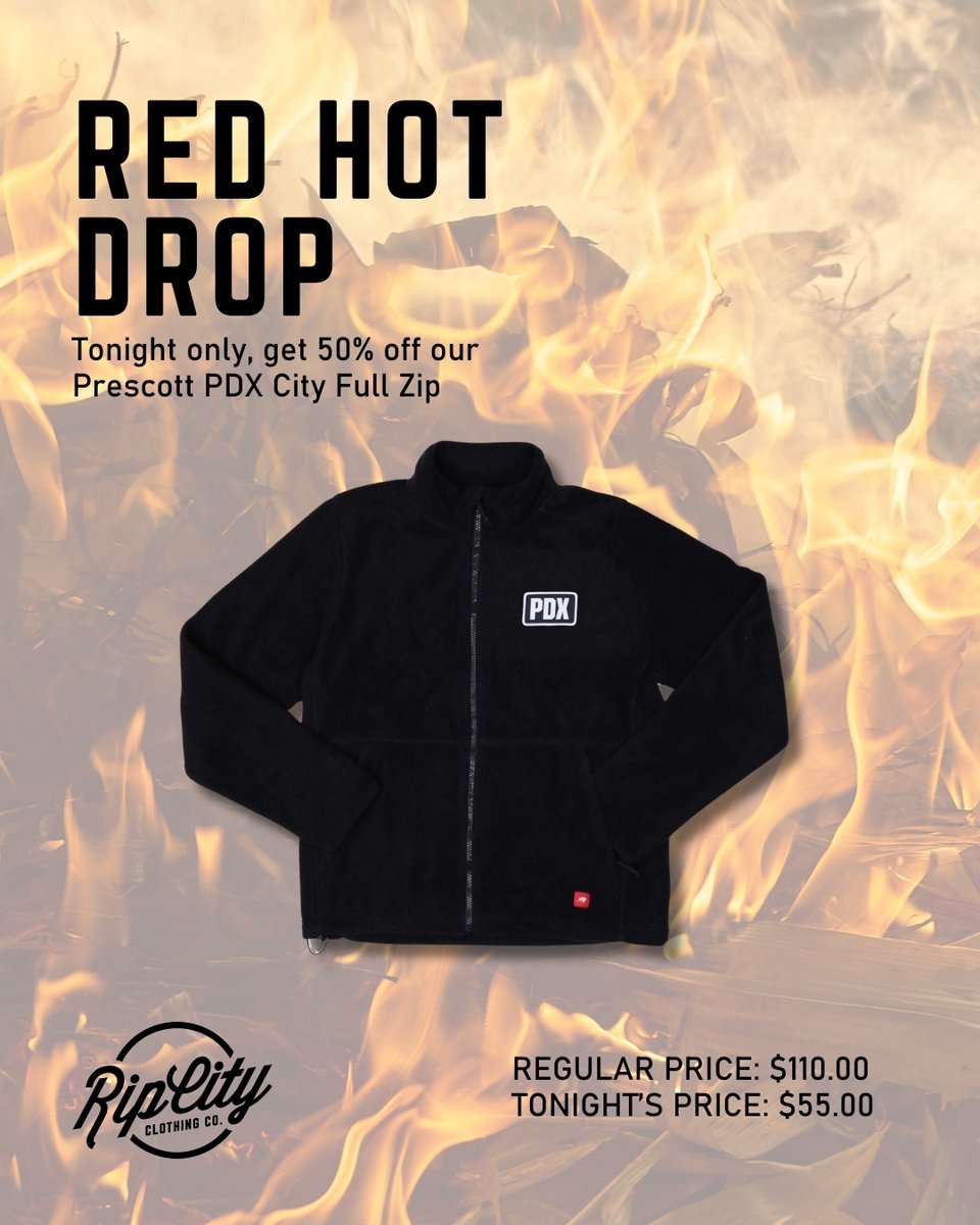 Tonight’sRedHotDrop:50%offthePrescottPDXCityFullZipJacket!ShopthedealatRipCityClothing(EntryA-19)ortapthelinkintheirbiobeforeit’stoolate.