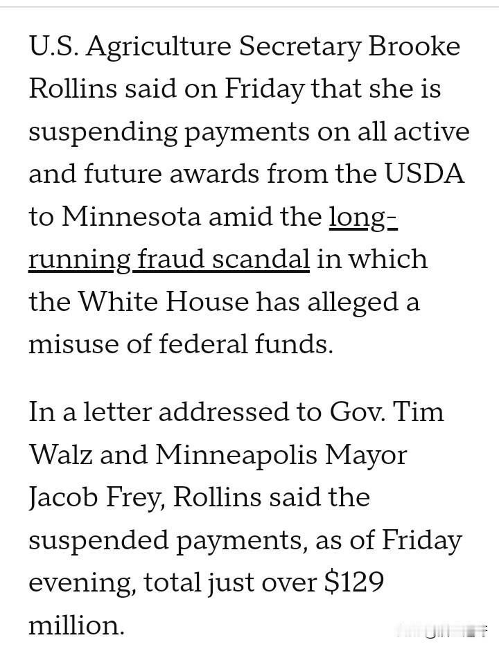 美国明尼苏达州明尼阿波利斯发生移民和海关执法局当街枪杀37岁女子,然后包括明尼阿波利斯在内的其他州市爆发了强烈抗议示威活动,然后,美国农业部干了这个事:鉴于长期存在的欺诈丑闻,暂停向明尼苏达州拨款,被暂停的金额超过$1.29亿美元,涵盖托儿补贴、食物补贴、低收入与残疾人的现金补贴、医保报销等。 参考信息:明尼苏达州是蓝州,民主党人主政。 🤔 川普目的明确:为自己的中期选举做准备。 明尼苏达州