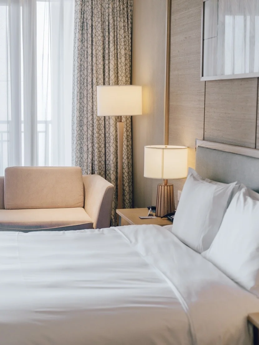 我们住的湖景房简直绝了!推开窗就是湛蓝湖面,远处青山如黛,暖阳洒在波光粼粼的水面上,像打翻了一整瓶碎钻。房间设计是现代简约风,浅木色家具搭配落地窗,床头挂着抽象水墨画,连浴室的大理石纹路都像天然艺术品。最惊喜的是床品——希尔顿招牌的“恬静之床”,软硬适中,躺下去瞬间被包裹感治愈,累了一天的身体直接“充电成功”!