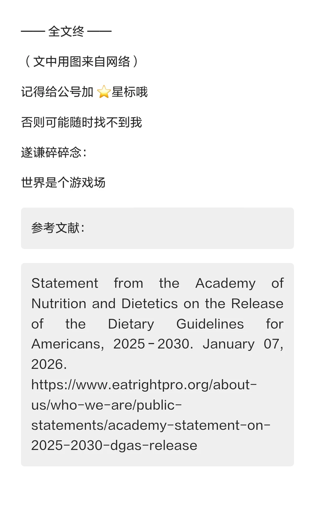 虽然它也照例提了少吃加工食品和限糖等,但整体跟美国营养师协会的主流科学共识对不上。看完真心觉得,政策背后水太深,大家养生的路,还是得多看看那些被时间验证过的经典,别被一阵风带跑偏了。