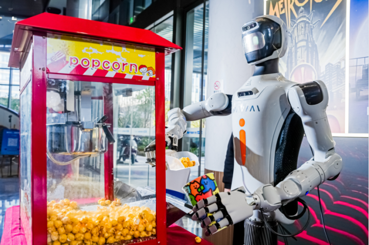 走进音乐厅,迎面扑来一阵爆米花的香气。来自浙江人形机器人创新中心的机器人从爆米花保温柜中,铲出一勺金黄的爆米花,放进纸杯里递给大家。