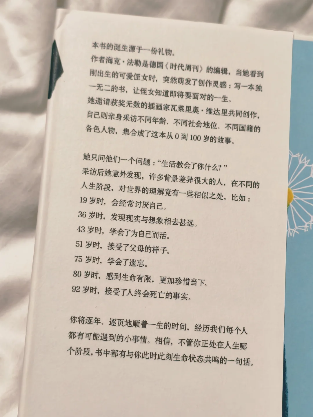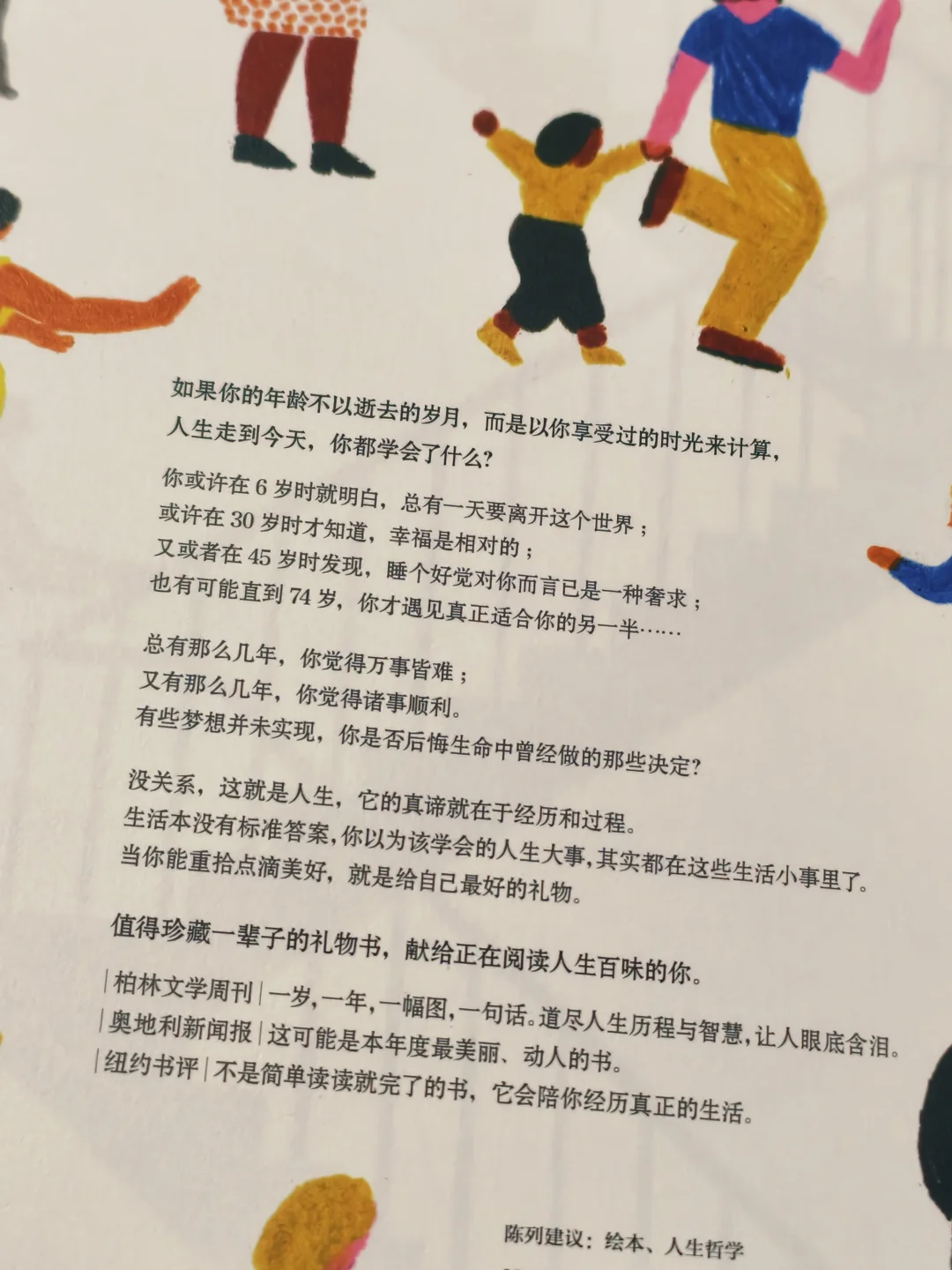 当社会时钟把我们逼成陀螺,这本书却温柔提醒:23岁坠入爱河很好,71岁再遇见初恋也不晚。你看,人生不是标准化生产线,而是各自绽放的花园。那个总在加班到凌晨的朋友说,翻到"45岁,你学会了为自己煮一锅刚好一人份的汤"时,她终于给自己买了束花。