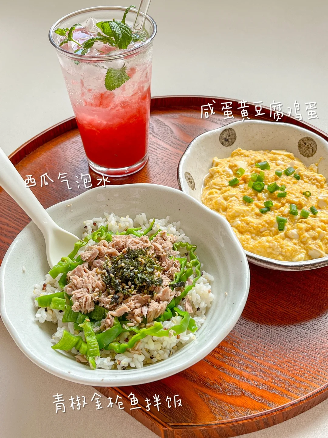 “吃的简单有很多好处,比如很快能吃上饭,这餐只用了十分钟,而且做完饭不用费力收拾厨房,夏天真的很不喜欢满是油点子的炉灶!” 今日午餐: ¹青椒金枪鱼拌饭 ²咸蛋黄鸡蛋豆腐 ³西瓜气泡水