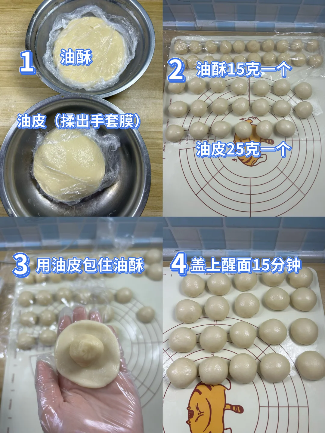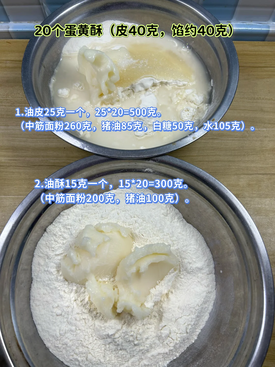 2.油酥15克一个,15*20=300克。