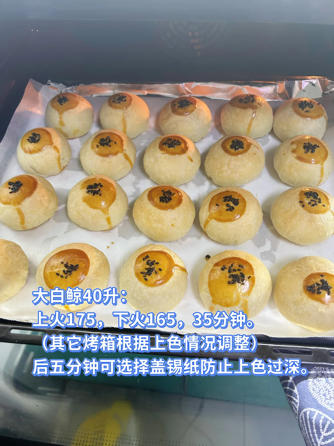 大白鲸40升:上火175,下火165,35分钟。(其它烤箱根据上色情况调整)后五分钟可选择盖锡纸防止上色过深。