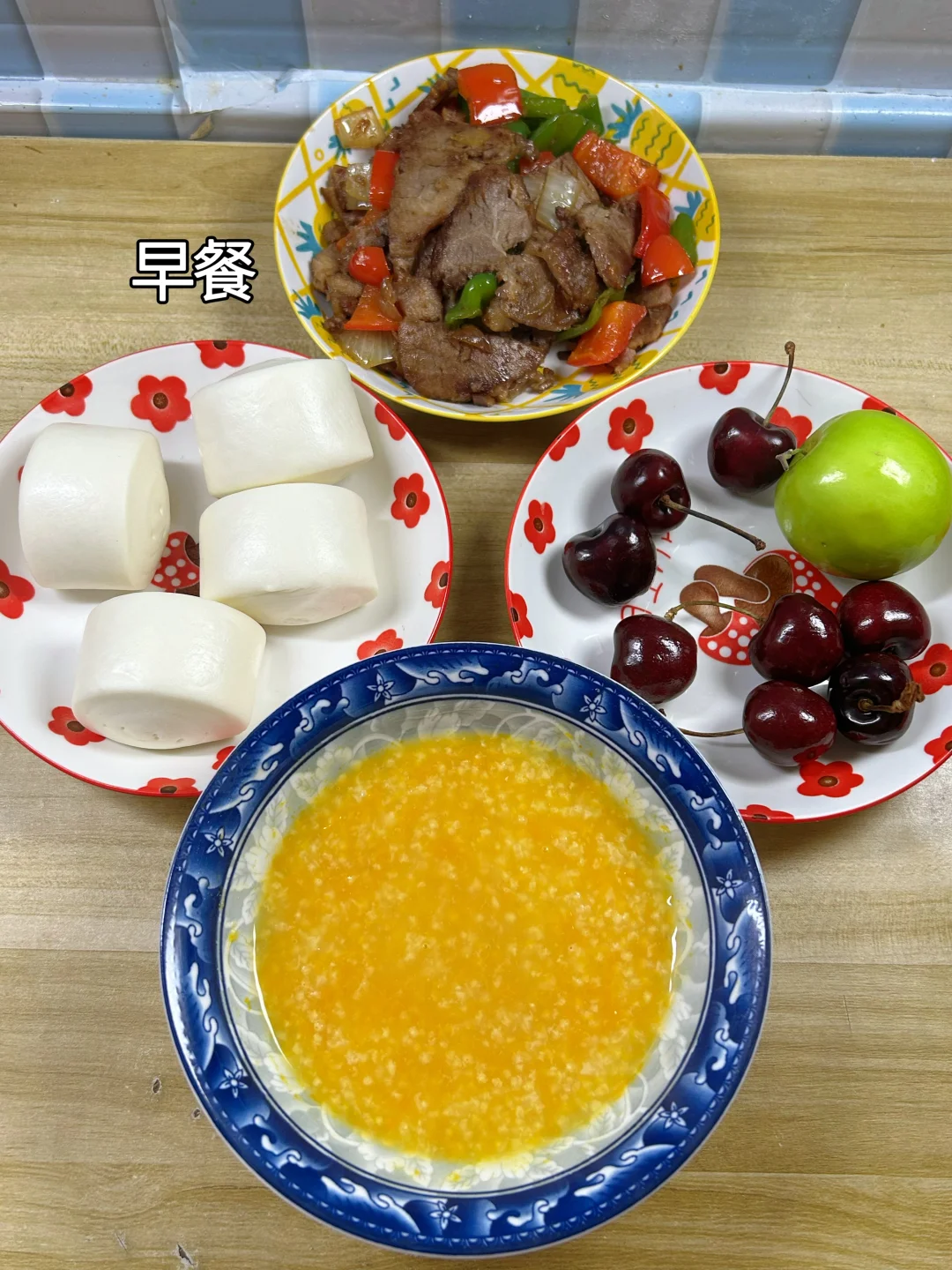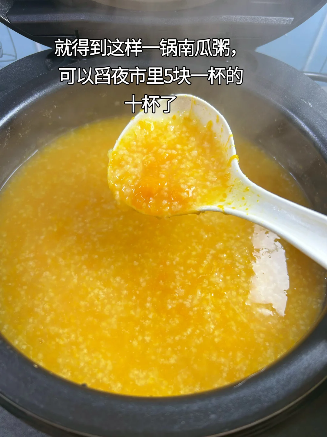 夜市里特别受欢迎的南瓜粥,在家用电饭煲一键搞定,老南瓜一块,大米小米各50克,煮一大锅,能舀夜市杯子的十杯了。早餐一人一碗,暖和又营养。 步骤: 1.老南瓜去皮去瓤,切块。 2.大米小米各50克,洗净,放入电饭煲。 3.加南瓜块,加满水,至煮粥刻度线,用煮粥键煮1.5小时。 4.南瓜已煮烂,但是还是块状,用勺子搅拌几圈就化开了。 5.根据需要加白糖,根据浓稠度再加开水稀释一下,搅拌均匀。 6.配上馒头、水果,再搭配一盘牛肉,当早餐或晚餐都很好。