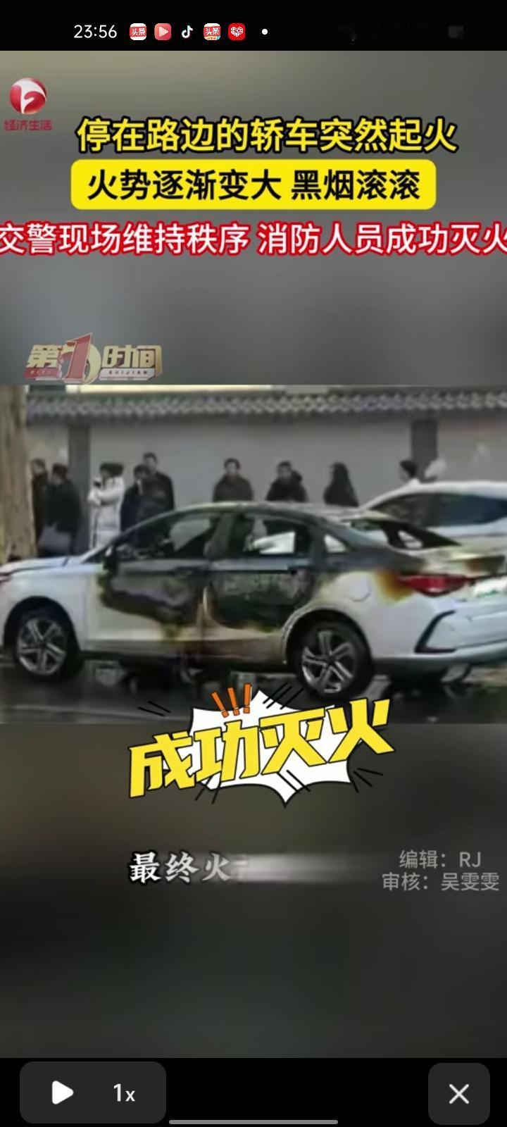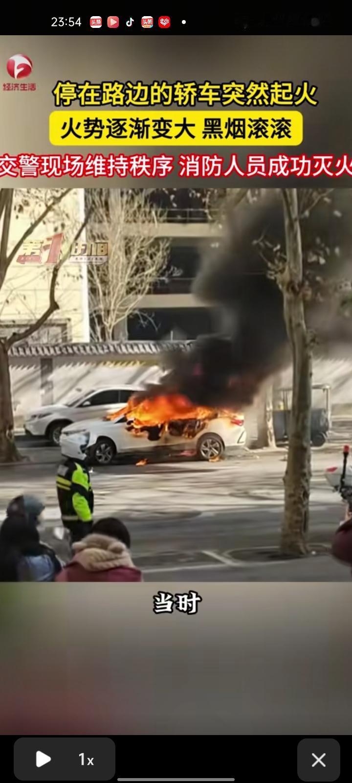 1月7日,陕西西安。网友发视频称,停在路边的轿车突然起火,火势逐渐变大,黑烟滚滚。三位交警在现场维持秩序,之后来了三辆消防车、一辆应急车,最终火被扑灭了。听别人说是新能源汽车,人没事就好。