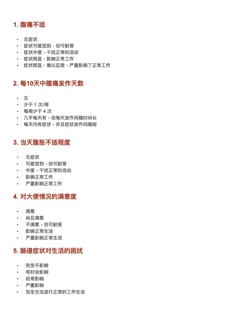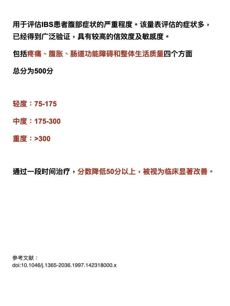 IBS-SSS用于评估IBS患者腹部症状的严重程度。该量表评估的症状多,已经得到广泛验证,具有较高的信效度及敏感度。 包括疼痛、腹胀、肠道功能障碍和整体生活质量四个方面 总分为500分 轻度:75-175 中度:175-300 重度:>300 通过一段时间治疗,分数降低50分以上,被视为临床显著改善。 参考文献: doi:10.1046/j.1365-2036.1997.142318000.xIF: 7.6 Q1