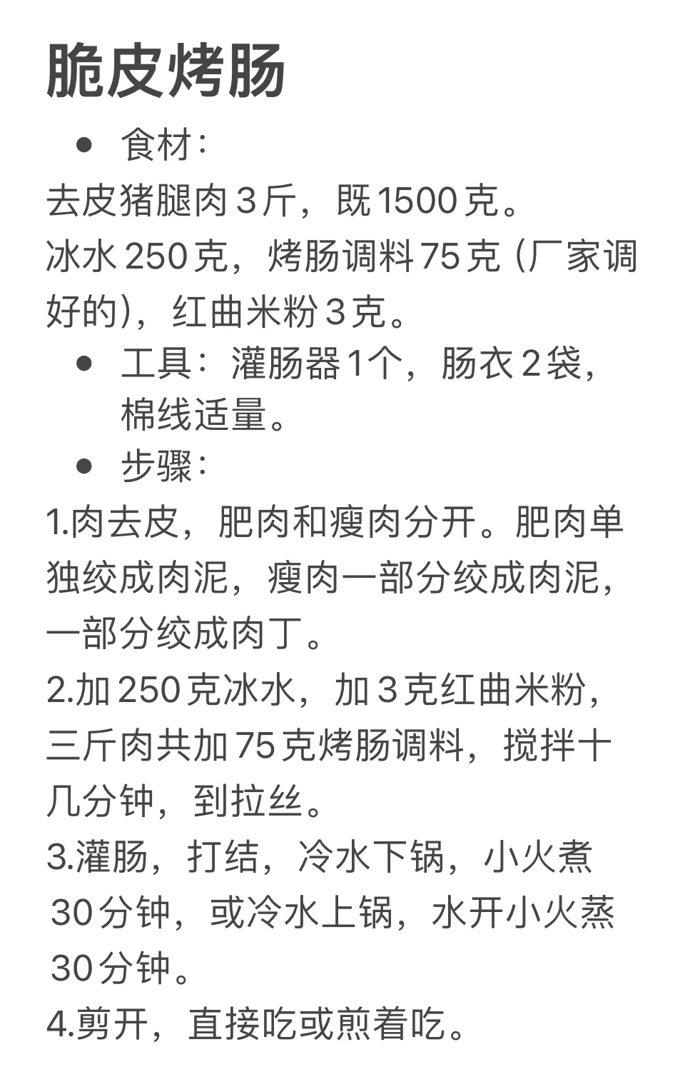 烤肠的简单做法: 1.肉绞碎,一斤肉放80克冰水,25克调好的烤肠调料,搅拌上劲。 2.肠衣洗净,灌肠,绑线,扎孔,吹干。 3.小火煮或蒸30分钟。 准备灌肠器、肠衣、调料、肉,就可以开始做啦!
