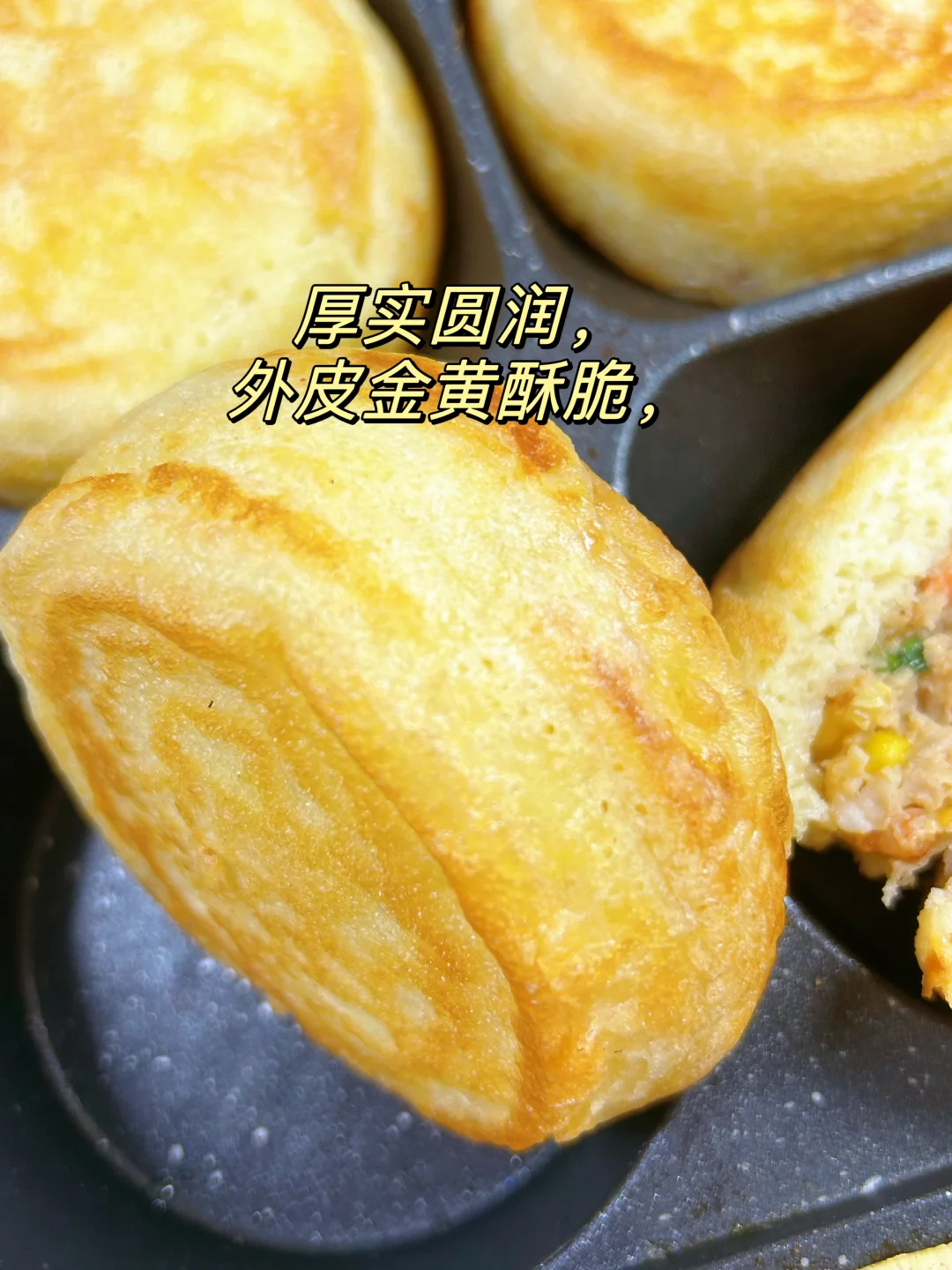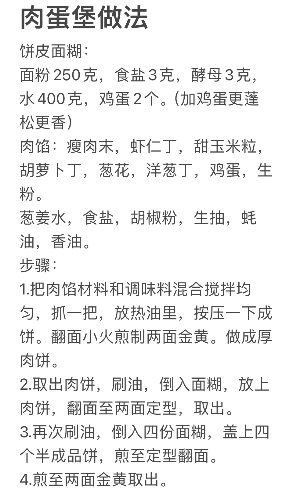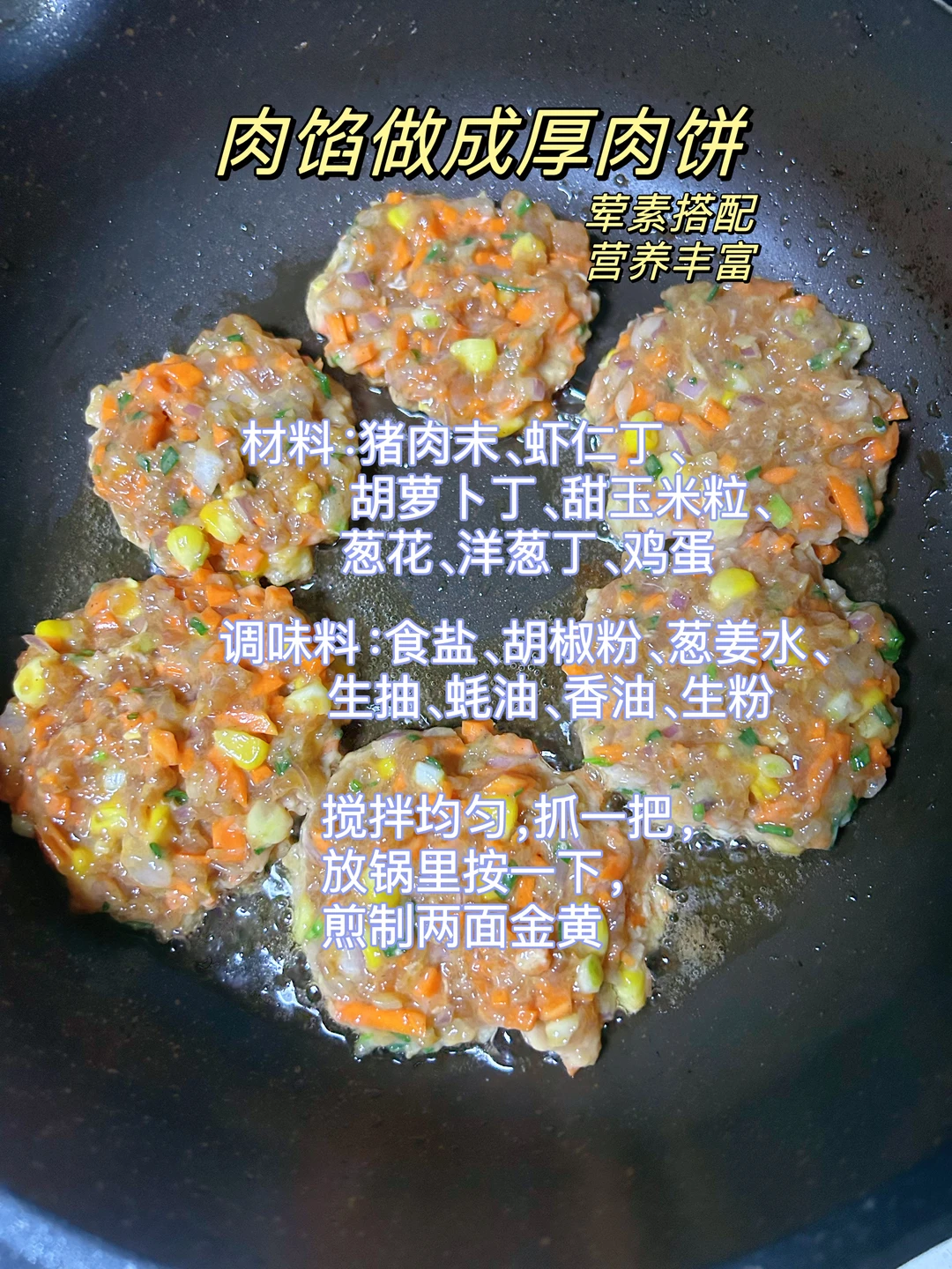 用我这个方法做的馅料厚实丰富,有肉有虾仁还有蔬菜和玉米,给孩子当早餐营养又美味。(可以提前一夜把面糊发起来,再放冰箱冷藏早上用)。 饼皮面糊: 面粉250克,食盐3克,酵母3克,水400克,鸡蛋2个。(加鸡蛋更蓬松更香) 肉馅:瘦肉末,虾仁丁,甜玉米粒,胡萝卜丁,葱花,洋葱丁,鸡蛋,生粉。 葱姜水,食盐,胡椒粉,生抽,蚝油,香油。 步骤: 1.把肉馅材料和调味料混合搅拌均匀,抓一把,放热油里,按压一下成饼。翻面小火煎制两面金黄。做成厚肉饼。 2.取出肉饼,刷油,倒入面糊,放上肉饼,翻面至两面定型,取出。 3.再次刷油,倒入四份面糊,盖上四个半成品饼,煎至定型翻面。 4.煎至两面金黄取出。