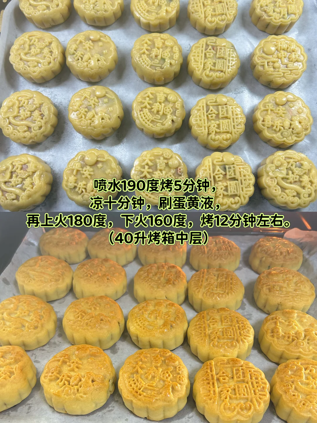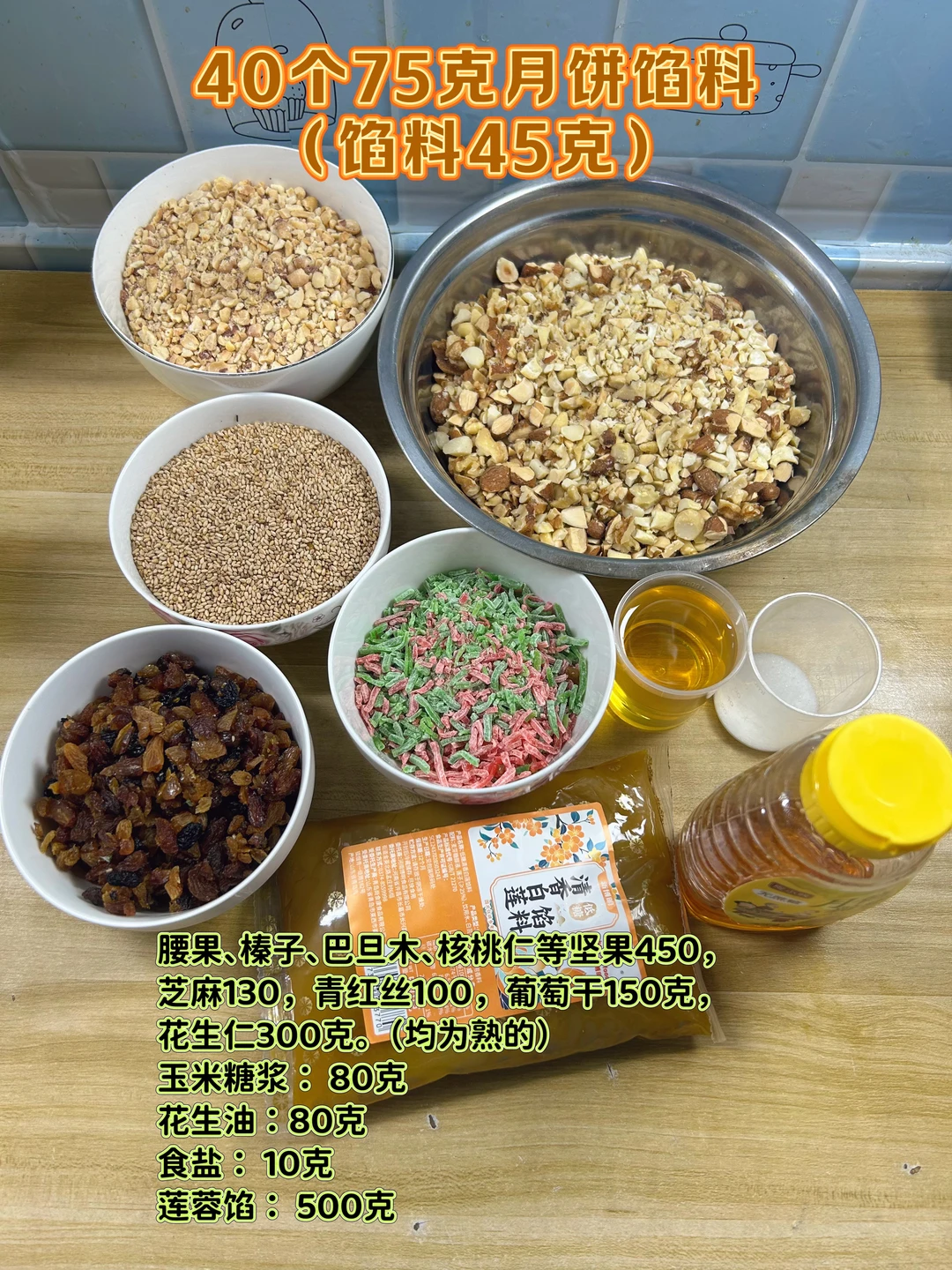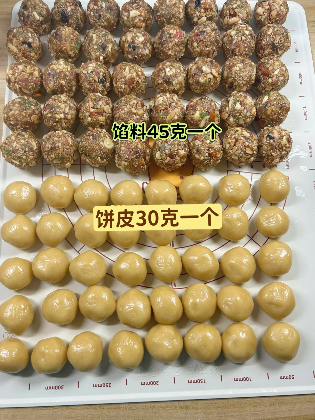 想做20个可以用一半材料,批量做也没问题。 [玫瑰R]馅料比例: 腰果、榛子、巴旦木、核桃仁等坚果450,芝麻130,青红丝100,葡萄干150克,花生仁300克。(均为熟的) 玉米糖浆: 80克 ​花生油:80克 ​食盐: 10克 ​莲蓉馅: 500克 [玫瑰R]饼皮比例: 饼皮材料(40个,每个30克,留有余量) 糖浆:420克 碱水:16克 花生油:160克 中筋面粉:645克 [玫瑰R]烘烤温度: 喷水190度烤5分钟,凉十分钟,刷蛋黄液,再上火180度,下火160度,烤12分钟左右。(40升烤箱中层) [玫瑰R]蛋黄液:1个蛋黄,5克花生油,5克清水。刷子在碗边正反刮几下,再刷薄薄一层。