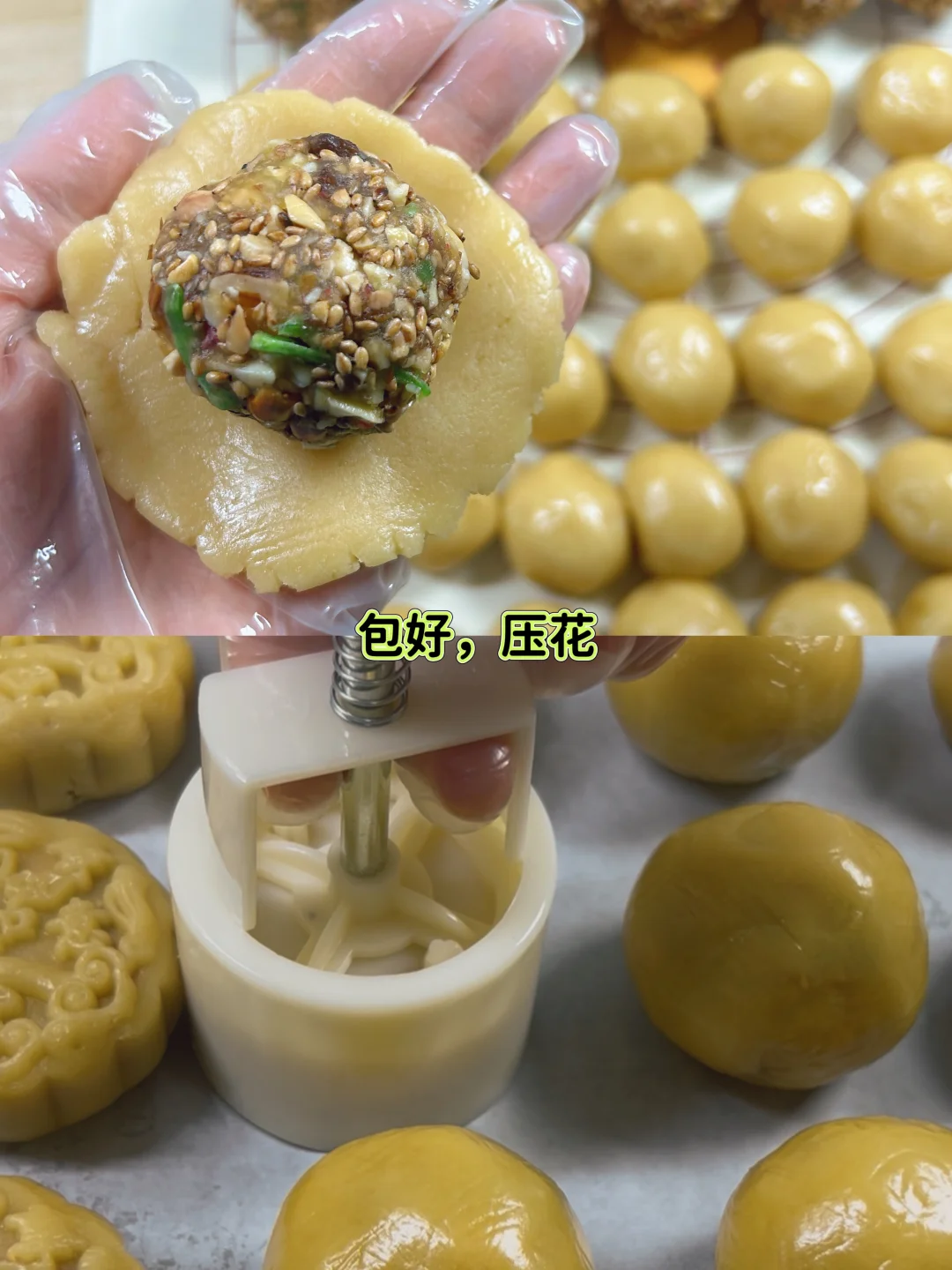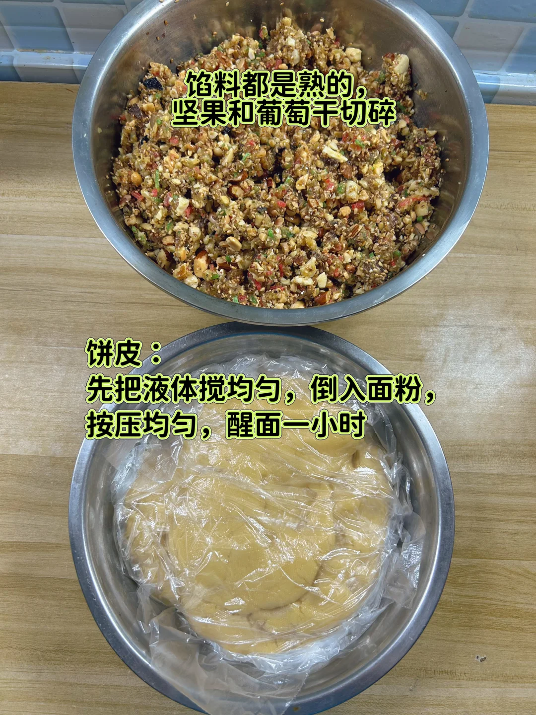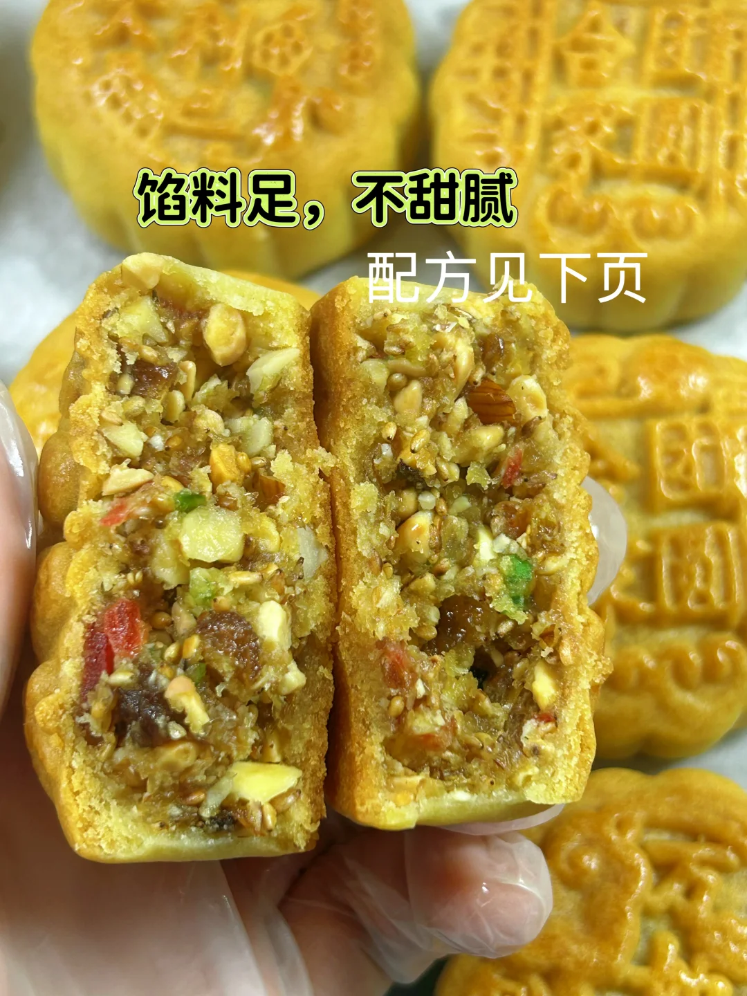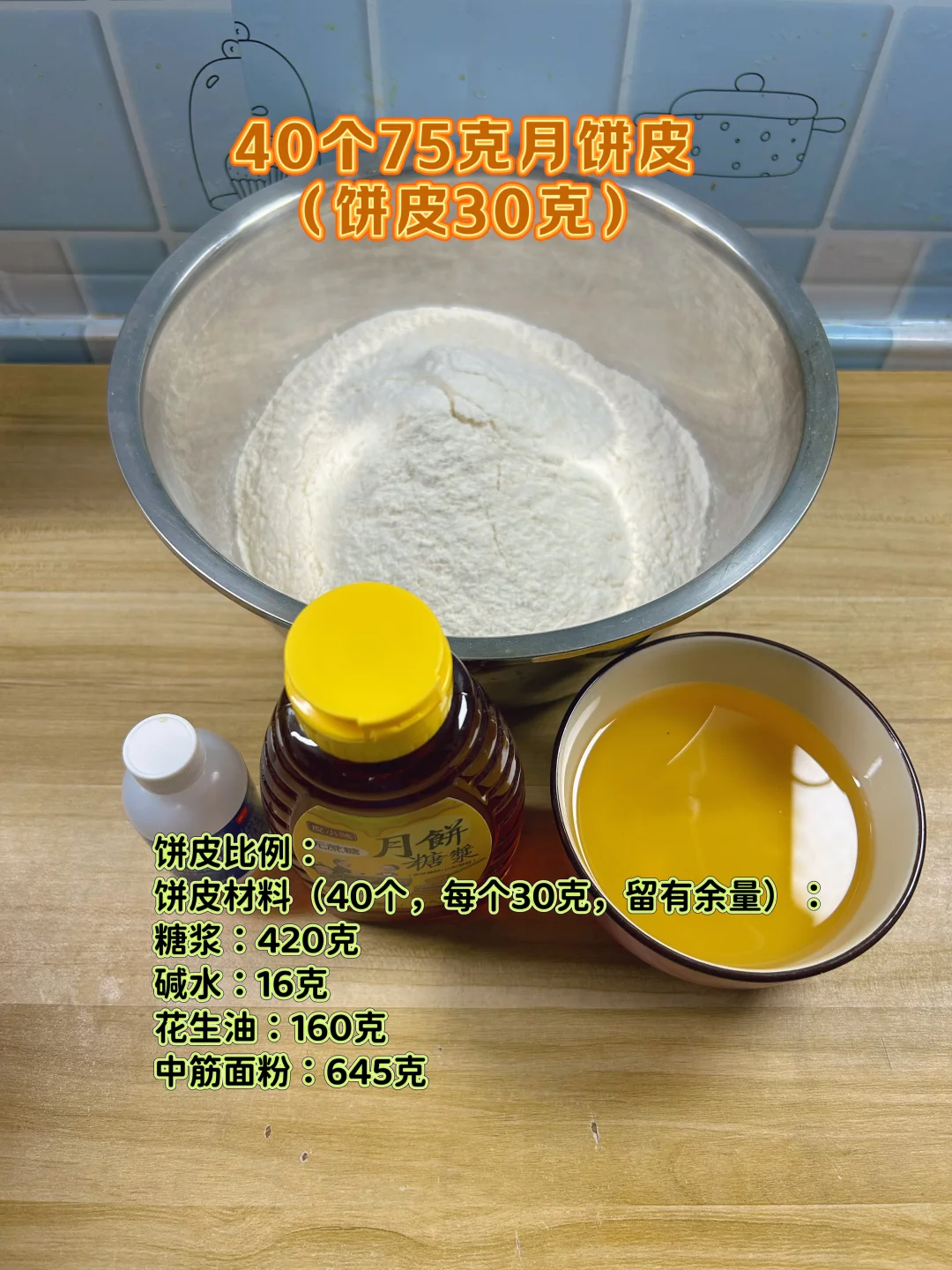 想做20个可以用一半材料,批量做也没问题。 [玫瑰R]馅料比例: 腰果、榛子、巴旦木、核桃仁等坚果450,芝麻130,青红丝100,葡萄干150克,花生仁300克。(均为熟的) 玉米糖浆: 80克 ​花生油:80克 ​食盐: 10克 ​莲蓉馅: 500克 [玫瑰R]饼皮比例: 饼皮材料(40个,每个30克,留有余量) 糖浆:420克 碱水:16克 花生油:160克 中筋面粉:645克 [玫瑰R]烘烤温度: 喷水190度烤5分钟,凉十分钟,刷蛋黄液,再上火180度,下火160度,烤12分钟左右。(40升烤箱中层) [玫瑰R]蛋黄液:1个蛋黄,5克花生油,5克清水。刷子在碗边正反刮几下,再刷薄薄一层。