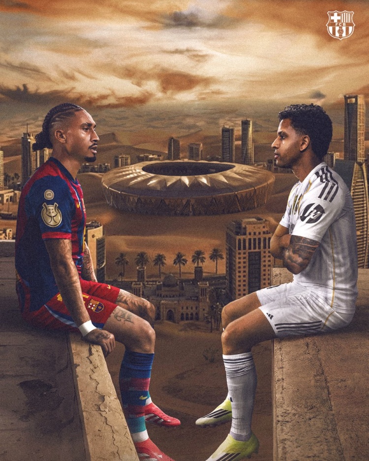 巴萨官方社媒发布了为此役制作的海报,内容为拉菲尼亚pk罗德里戈,背景则是吉达阿卜杜拉国王体育场。