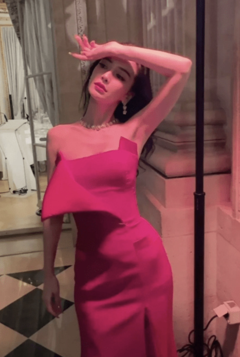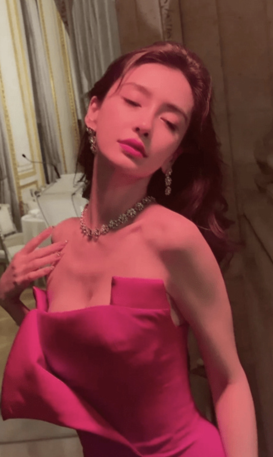 在照片里,她在红色灯光映照下,微闭双眼,全身投入在某种神秘的氛围中。她轻触肩膀,胭脂丹唇紧闭,仿佛在默默诉说着什么,这一切所有神态和动作都让人与红衣女郎形象产生联想。是不是杨颖在展示自己新的形象或尝试,还是她想在挑战自我的同时展现自己的艺术极限?