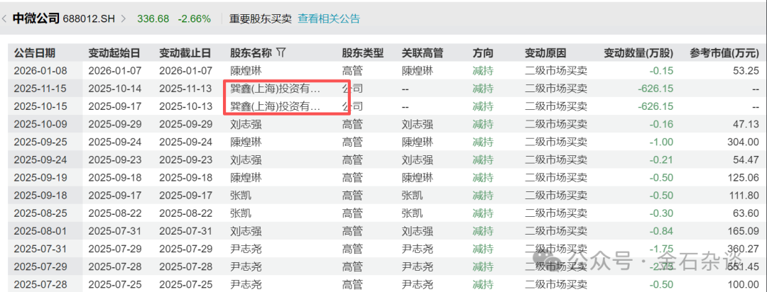 根据公告,公司董事长、总经理尹志尧计划减持公司股份数量不超过29万股,占公司总股本比例0.046%。以中微公司最新股价粗略计算,尹志尧拟减持股票市值约为9764万元。