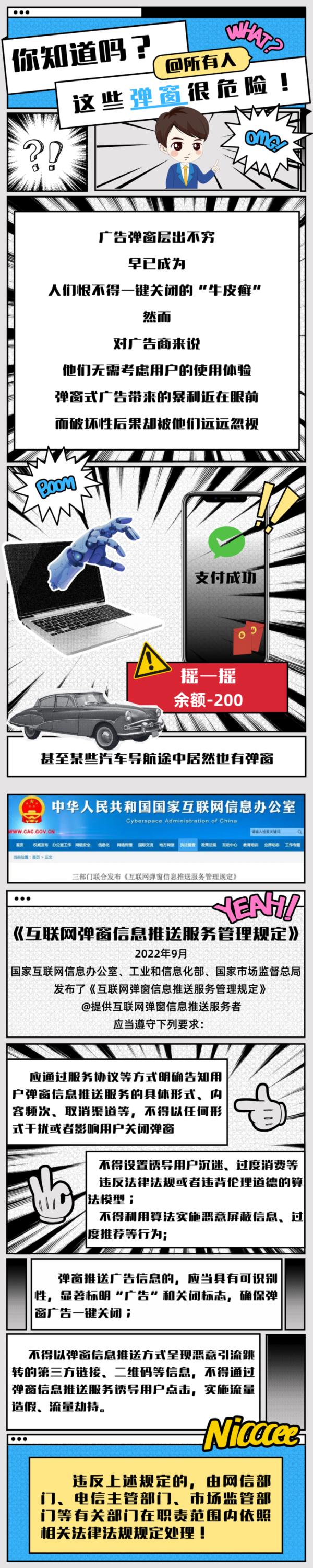 《规定》强调,互联网弹窗信息推送服务提供者应当遵守优化推送内容生态、强化互联网信息服务资质管理、规范新闻信息推送、科学设定推送内容占比、健全推送内容审核流程、强化用户权益保障、合理算法设置、规范广告推送、杜绝恶意引流等九个方面具体要求。