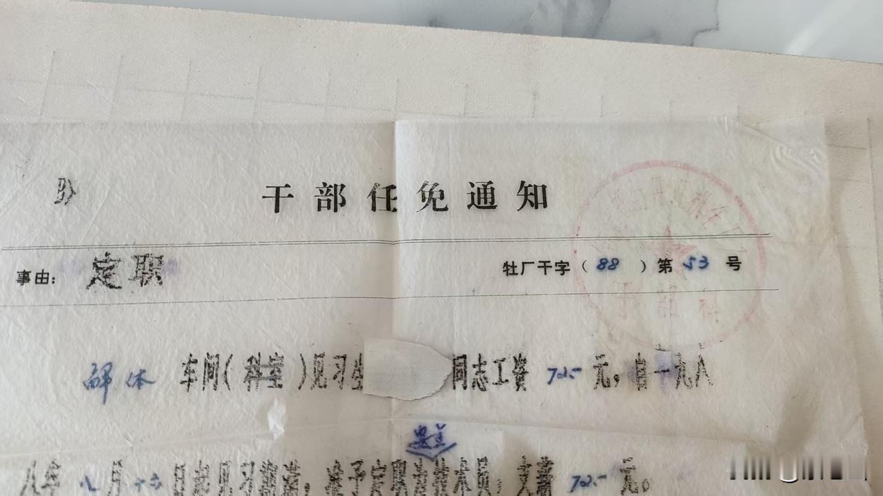一张泛黄的干部任免通知单 退休后在家整理书刊,翻出一张泛黄的干部任免通知单,我精心的把它展开,心中涌起了壮阔的波澜。 看着这清晰的字迹让我回忆起:1987年我从牡丹江市职工大学毕业后,被分配到机车工厂解体车间任见习生。 一年后见习期满,我收到了工厂这张干部任免通知书,内容如下: 事由:定职 解体车间见习生杨某某同志工资72元,自一九八八年八月十六日起见习期满,准予定职为安全技术员,支薪72元。 下面有主送:车间,抄送:人事科、财务科、总务科、组织部、存档、本人 铁道部牡丹江机车工厂 一九八八年 十月十六 日 当时我收到这份干部任免通知书后,心情非常高兴,用三年寒窗苦读,换来一纸任命通知书,因此而改变了我的命运。我很精心地把它夹在书本里保留下来。 退休后,这张通知书虽已无实际用途,但是我始终舍不得丢弃。 因为它承载着那个时代的珍贵记忆,默默见证我曾在原铁道部牡丹江机车工厂贡献青春的岁月,以及四十年如一日潜心工作的历史。