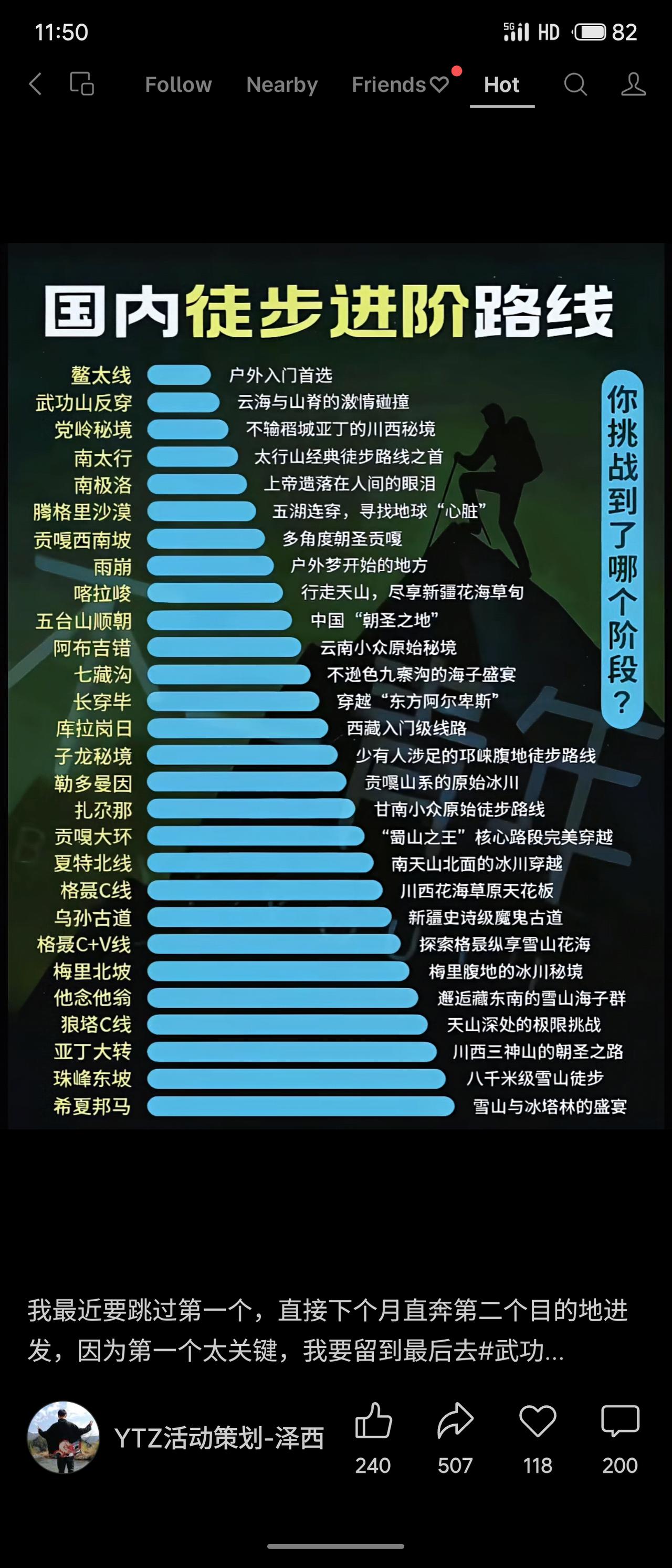 清单系统梳理了国内从入门到顶级的徒步路线,涵盖武功山、南太行等入门选择,贡嘎、雨崩等进阶挑战,以及狼塔C线、珠峰东坡等极限穿越,呈现了清晰的难度阶梯。发布者计划跳过首个“太关键”的路线,反映其可能将最经典或最具意义的路线留作压轴体验。整体来看,清单为户外爱好者提供了兼具实用性与启发性的进阶指引。