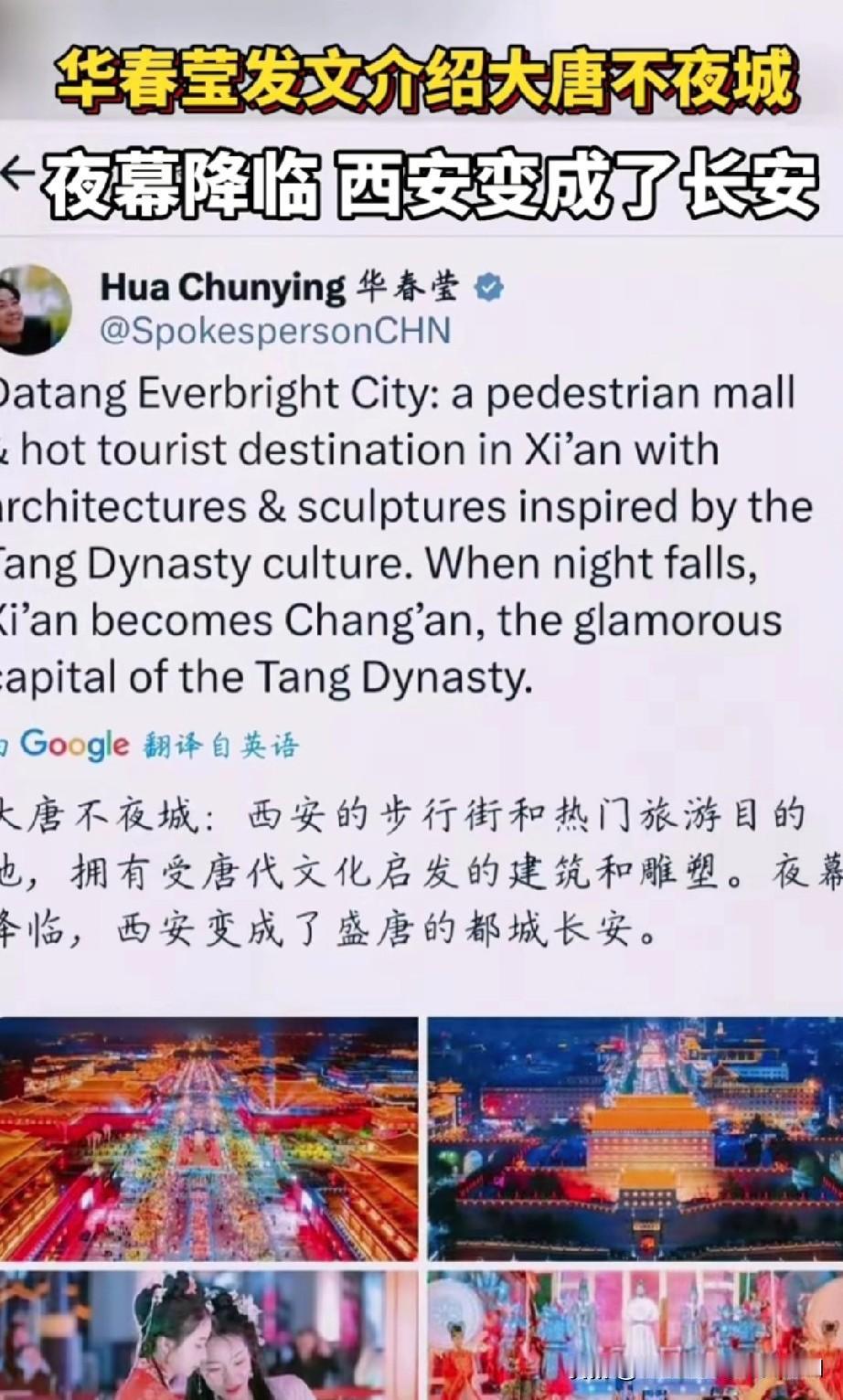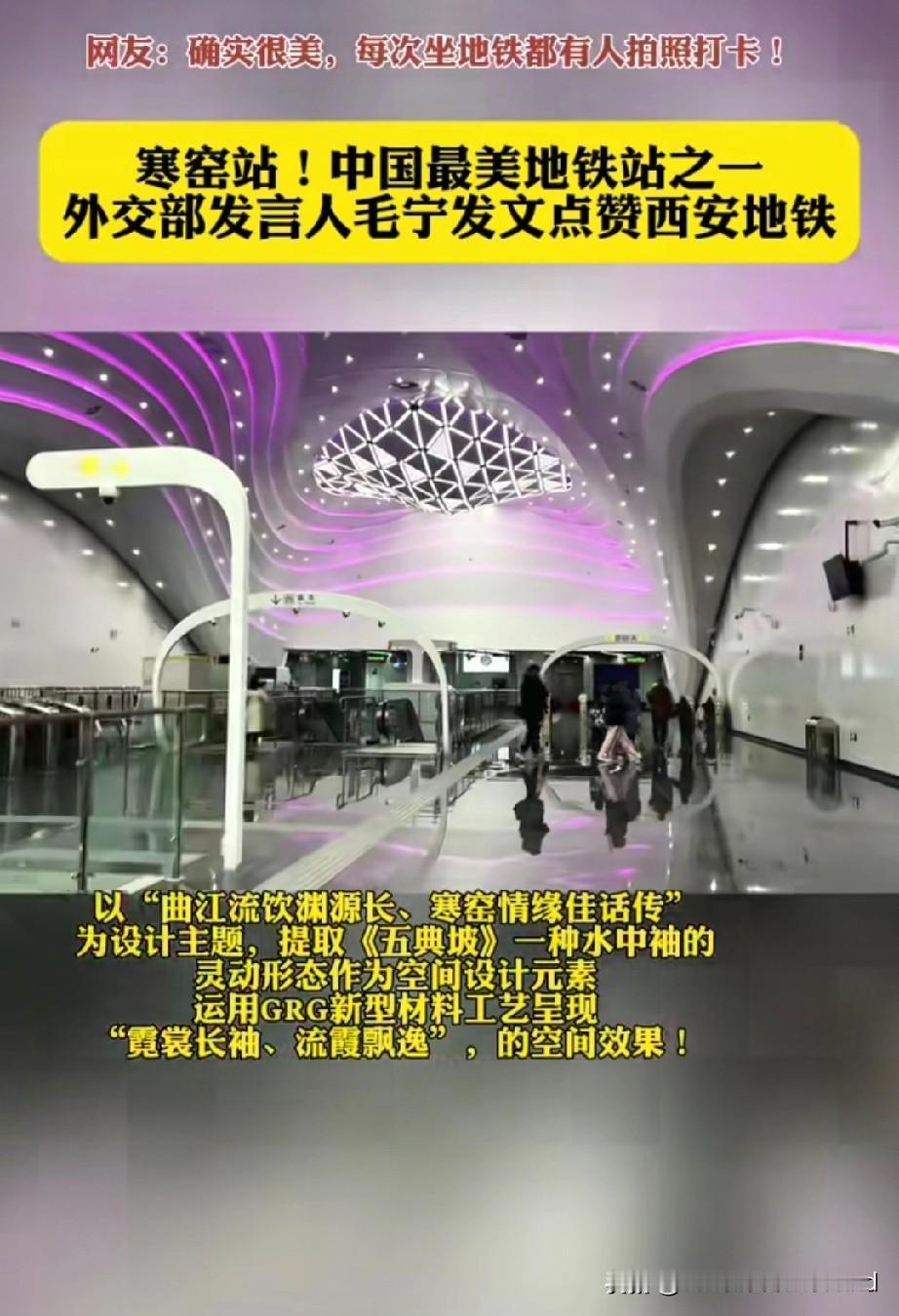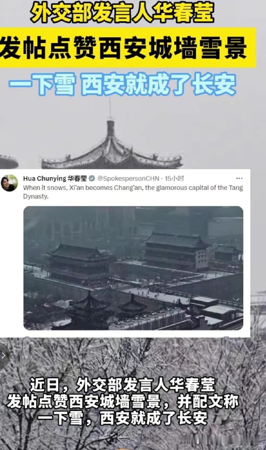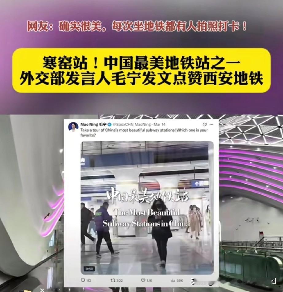 毛宁外网推荐西安皇子坡地铁站, 之前也推荐过寒窑地铁站。 外交部发言人情有独钟, 特别喜欢西安的历史文化。 华春莹也多外网发文次赞美西安, 她说:白天是西安,晚上是长安, 赞西安大唐不夜城的繁华。 一下雪,西安就成了长安, 赞雪中的西安城墙之美。 西安被国家定位世界旅游目的地, 名之实归!