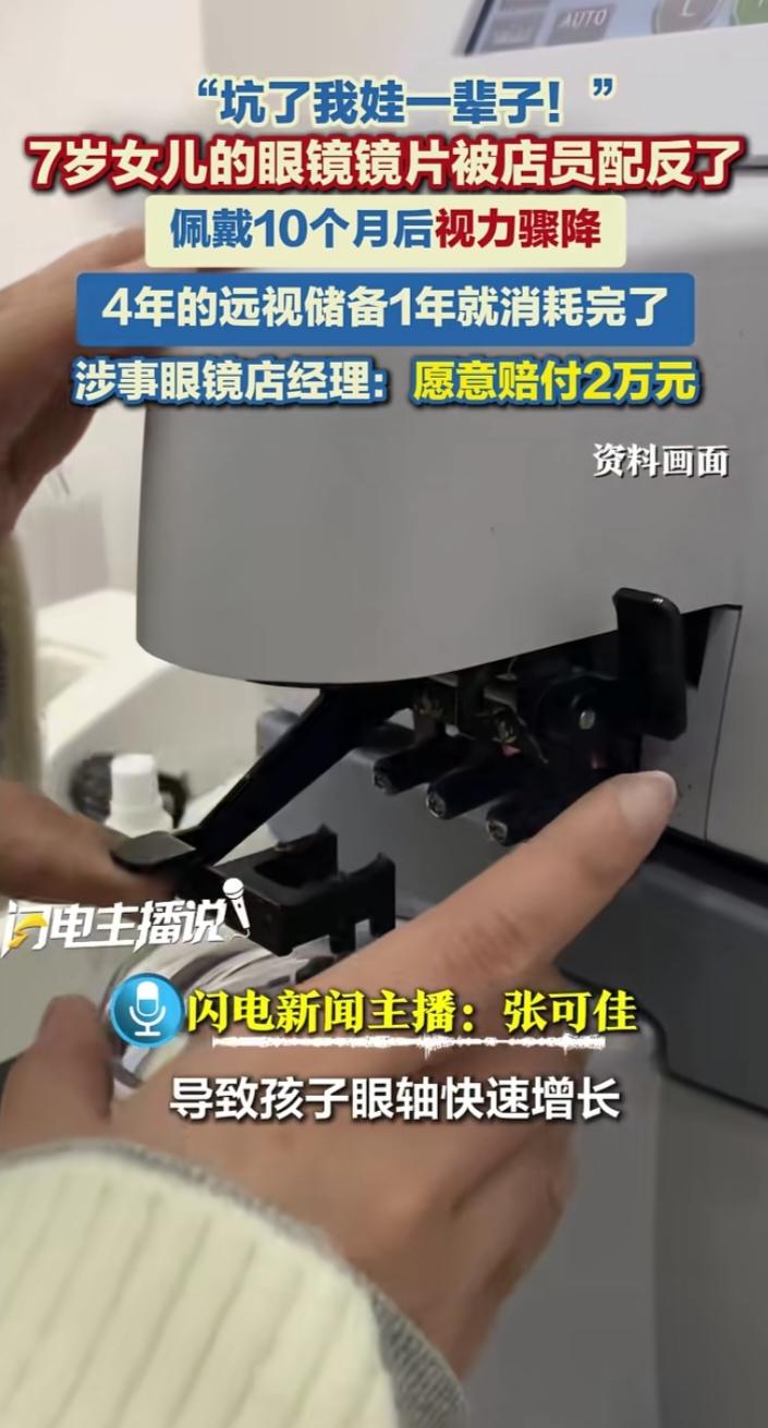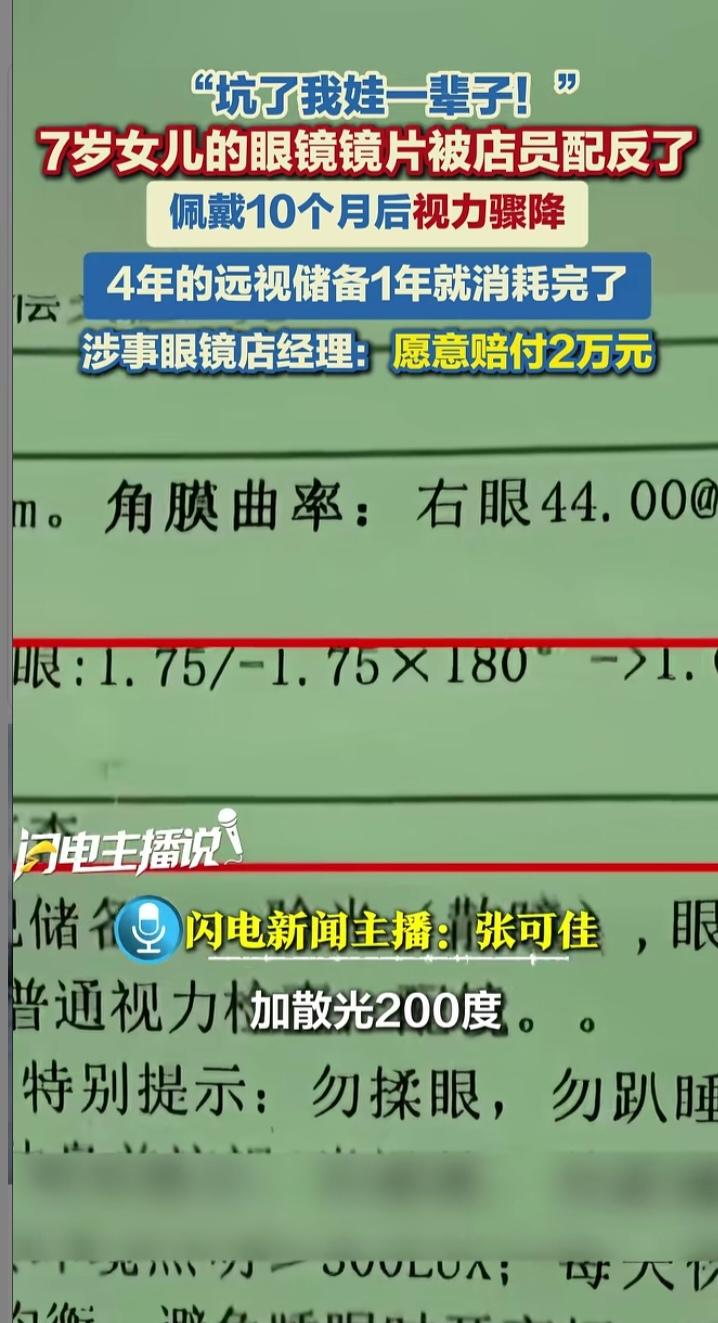 武汉家长崩溃!眼镜店把远视镜配成近视镜,7岁女童4年远视储备10个月清零 湖北武汉上演离谱一幕!杨女士去年2月带7岁女儿配镜,拿着医院“远视储备175度+散光200度”的验光单,却被眼镜店粗心配成近视款。 孩子戴镜10个月总喊眼酸,复查时竟查出近视,原本能撑4年的远视储备直接耗光。这波“反向矫正”让家长怒喊“坑娃一辈子”。 经协商,眼镜店赔付2万元,孩子已换离焦眼镜控制近视。网友调侃:这哪是配镜,简直是给视力“帮倒忙”,商家粗心可别让孩子买单!儿童近视管理镜 远视储备值