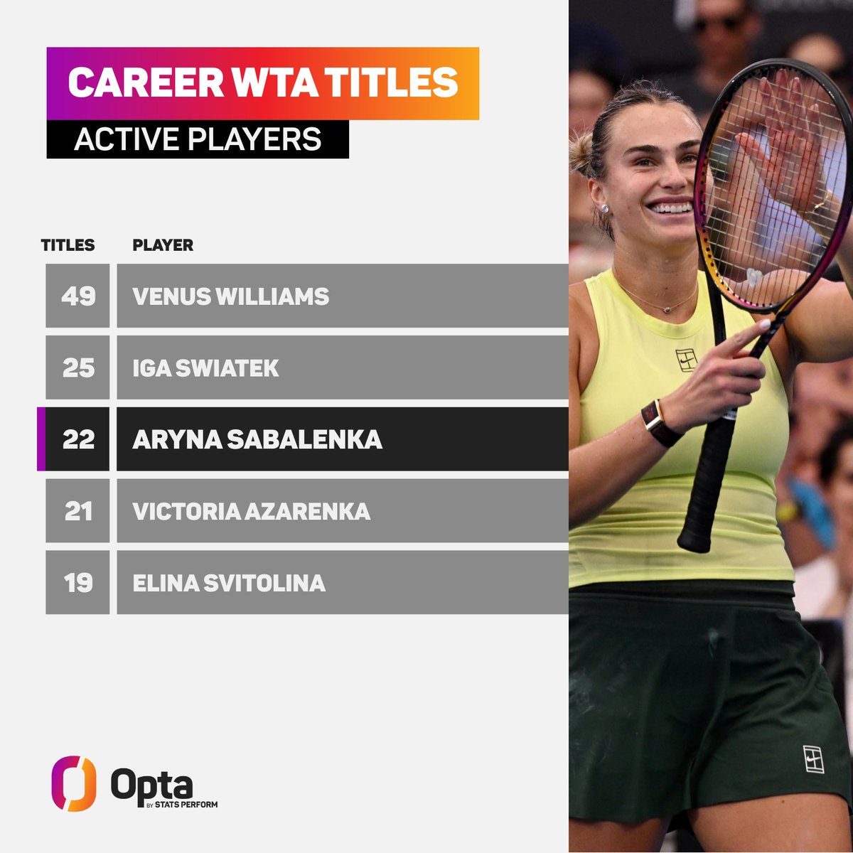 据统计,萨巴伦卡已赢得职业生涯第22个WTA冠军,超越维多利亚-阿扎伦卡(21冠),在现役WTA球员中独占第三位,仅次于维纳斯-威廉姆斯(49冠)和斯瓦泰克(25冠)。