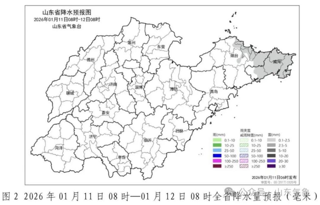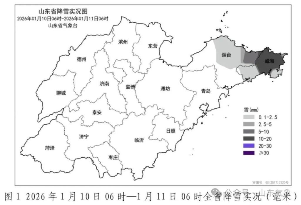 1月10日06时至11日06时,全省共有2市、12县(市、区)出现降雪,平均降水量0.5(毫米,下同)。各市平均:威海7.7和烟台1.8,其他市无降水。县(市、区)平均降雪量超过10.0的3个,5.0—10.0的2个,2.5—5.0的1个,前3位的是:威海市区18.5、威海荣成12.4和威海文登11.8。最大积雪深度排前3位的是,威海本站20厘米、威海荣成15厘米和烟台牟平13厘米。今年以来全省平均降水量0.6毫米,较常年同期偏少3.5(-85%)。