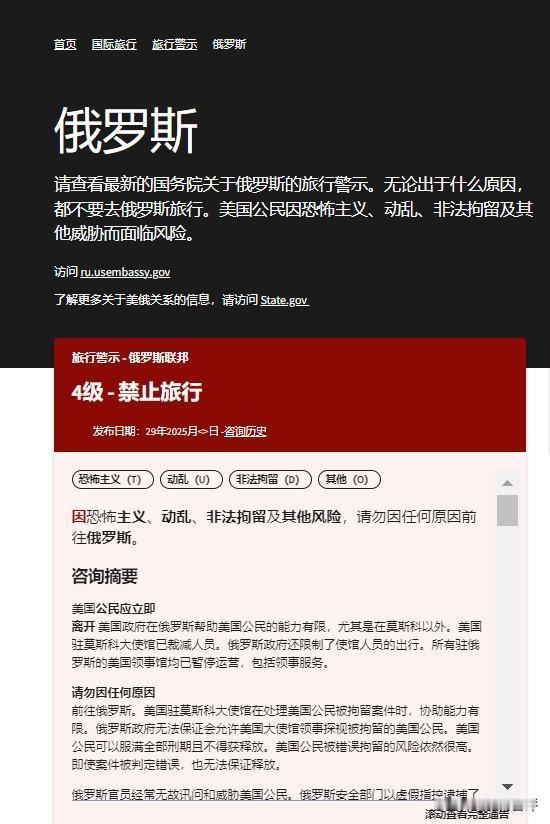 针对部分美国公民反映对来俄有一定担心,主要包括居留登记,社会治安,警察执法等方面,美国驻俄罗斯使馆的建议: 1、请勿因任何原因前往俄罗斯。美国驻莫斯科大使馆在处理美国公民被拘留案件时,协助能力有限。俄罗斯政府无法保证会允许美国大使馆领事探视被拘留的美国公民。美国公民可以服满全部刑期且不得获释放。美国公民被错误拘留的风险依然很高。即使案件被判定错误,也无法保证释放。 2、俄罗斯官员经常无故讯问和威胁美国公民。俄罗斯安全部门以虚假指控逮捕了美国公民。他们剥夺了他们公平对待,并在没有可信证据的情况下定罪了他们。俄罗斯当局已对美国公民的宗教活动展开了可疑调查。 3、乌克兰边境附近以及莫斯科、喀山、圣彼得堡和其他大城市都发生了无人机袭击和爆炸。2024年,ISIS呼罗珊宣称对莫斯科克罗库斯音乐厅的袭击负责。这次袭击造成130人死亡。他们还袭击了达吉斯坦的宗教场所。遇到紧急情况时,应遵从当地当局的指示,寻找避难所。 4、示威活动在俄罗斯,和平集会和言论自由并非受保护的权利。美国公民应避免抗议活动,也避免在这些活动中拍摄安保人员。俄罗斯当局逮捕了参与抗议的美国公民。俄罗斯人和美国公民因社交媒体上的帖子被拘留。 5、电子设备重新考虑将电子设备引入俄罗斯。美国公民应假设俄罗斯境内所有电子通信和设备均被俄罗斯安全部门监控。俄罗斯安全部门根据电子设备中的信息逮捕了美国公民和其他外国人。这包括在其他国家创建、传输或存储的信息。 6、借记卡和信用卡 美国的信用卡和借记卡在俄罗斯已不再有效。由于制裁,从美国向俄罗斯发送电子货币几乎不可能。美国大使馆无法协助转账以规避制裁。 7、俄罗斯官员无故质疑、威胁并拘留美国公民。这包括前任和现任美国政府及军人,以及美国私人公民。俄罗斯当局有错误拘留美国公民并将其用作筹码的历史。 8、美国公民可能成为骚扰、虐待和敲诈的受害者。俄罗斯当局并不总是通知美国大使馆有关美国公民被拘留的情况。他们可能会延迟或拒绝美国领事的协助。 俄罗斯安全部门针对被视为“不受欢迎”的外国公民和国际组织。 9、对于在俄罗斯的美国公民: (1)国防部已认定,美国公民被错误拘留的风险极大。 (2)要做好被拘留未知时间的准备,可能没有明确原因,也无法联系大使馆或其他任何人寻求帮助。 (3)准备遗嘱并指定合适的保险受益人或授权书。 (4)与亲人讨论关于儿童、宠物、财产、物品、非流动资产(收藏品、艺术品等)、葬礼意愿等的照顾与监护计划。 (5)请将DNA样本留给您的医疗提供者,以备家人需要获取时使用。 …… 同样的俄罗斯,有人极力鼓动国人赴俄旅行,有人极力阻止国人赴俄旅游,谁更值得信任?