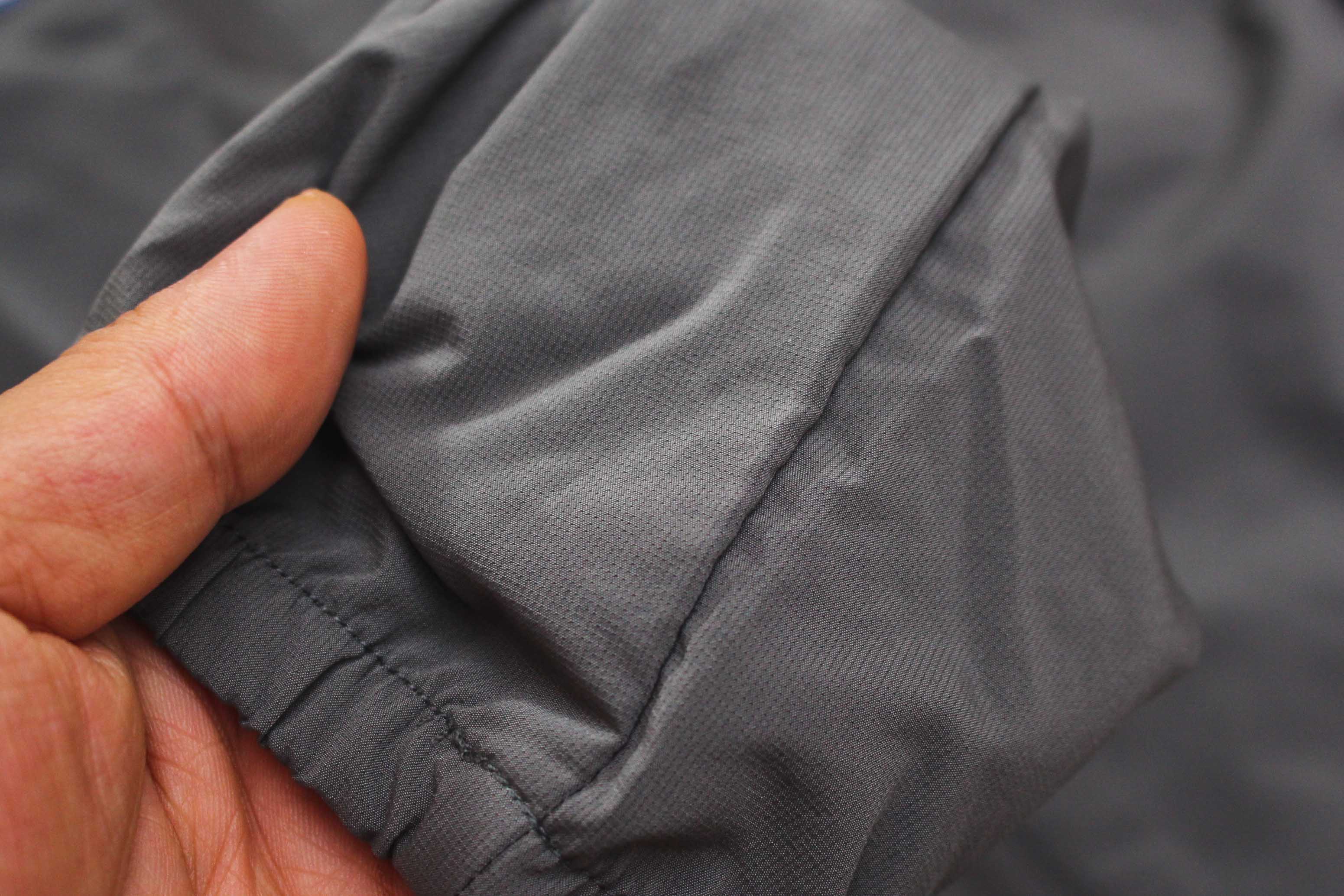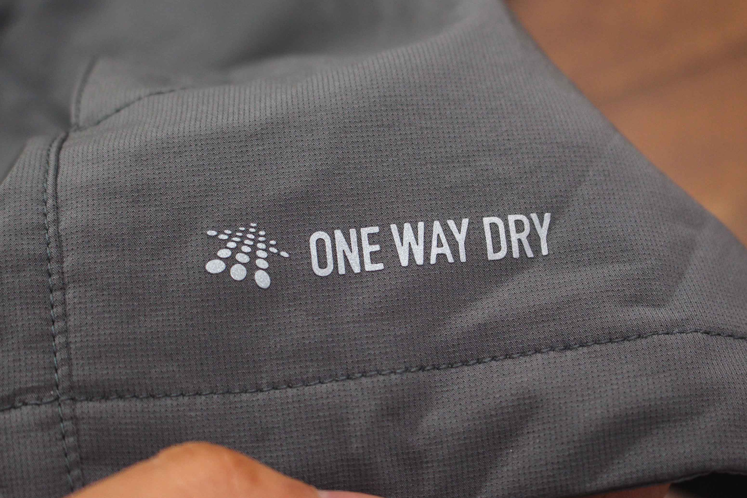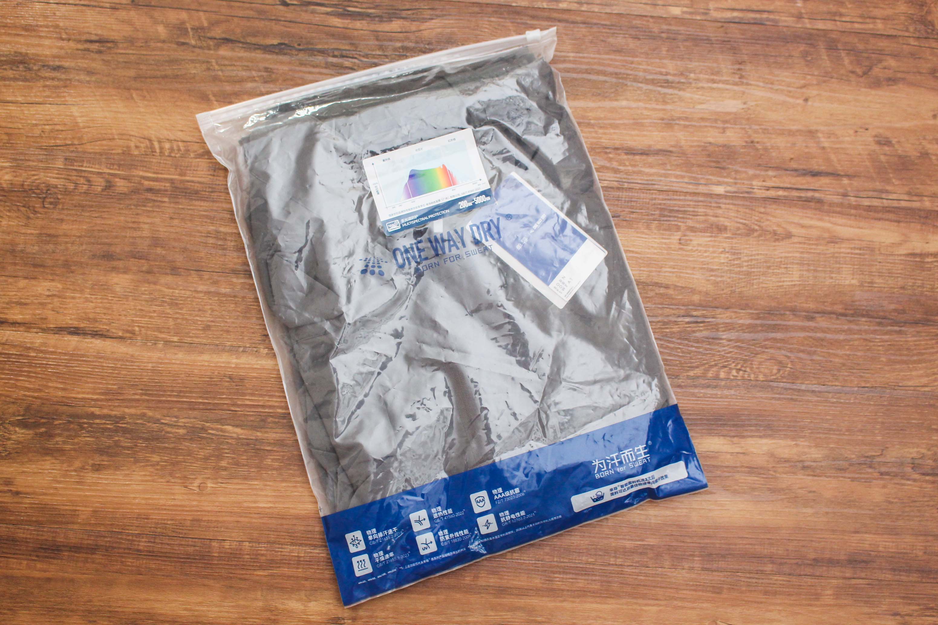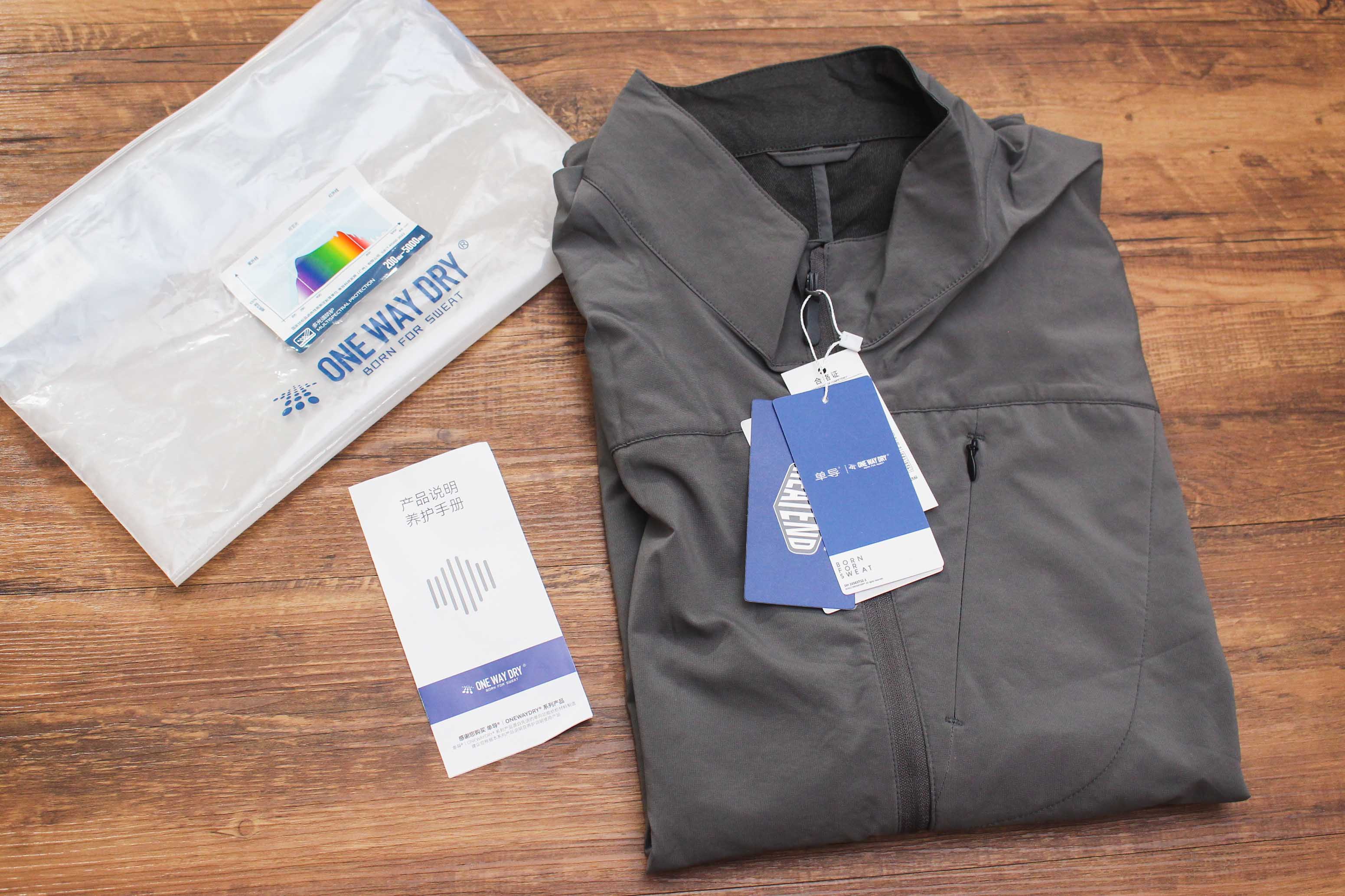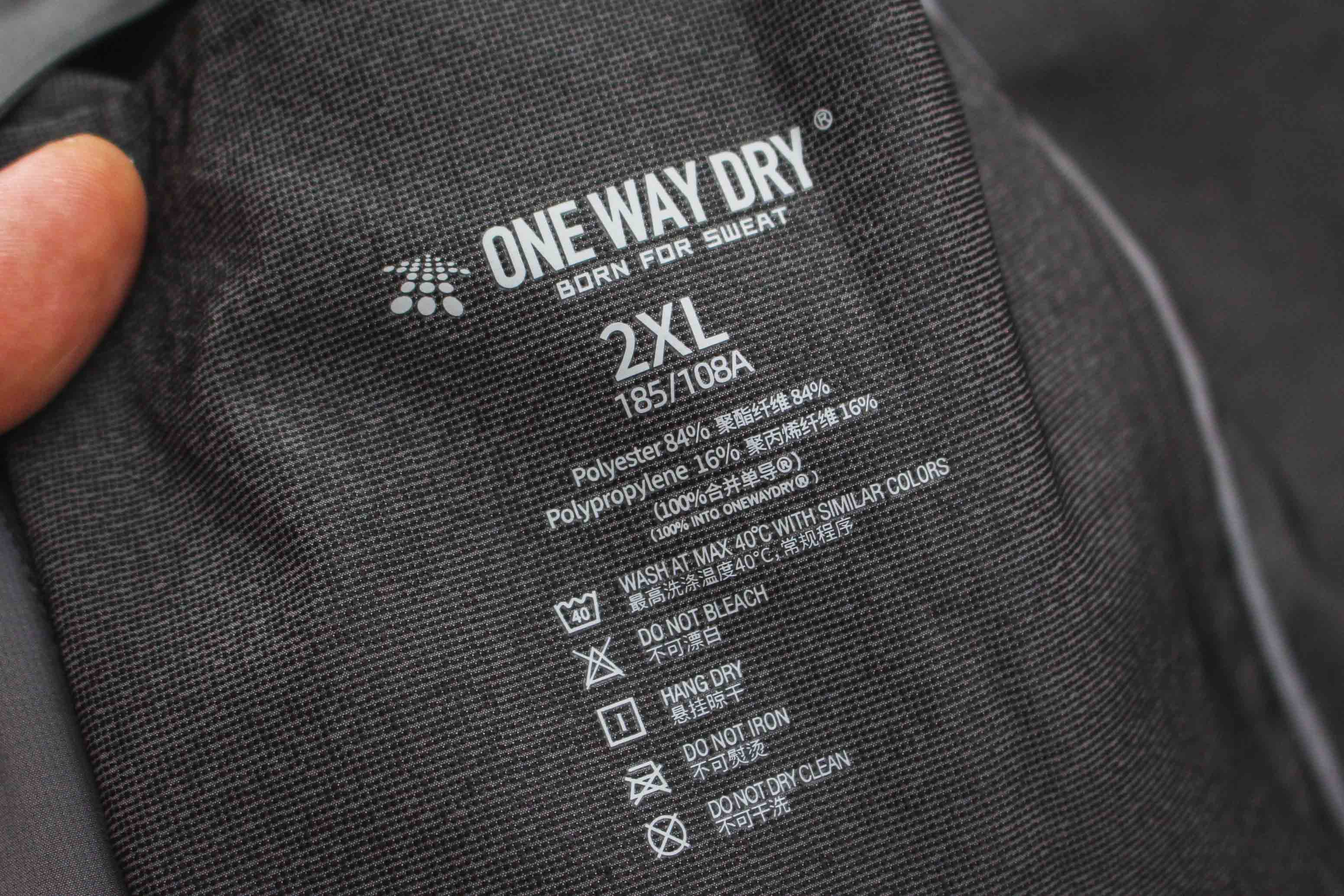 衣服的面料为84%聚酯纤维和16%聚丙烯纤维构成,内里面面料会是灰黑色外观,这一面也会有细小的方格材质,手摸上去是可以轻微的感受到这个材质的特别,皮肤接触后不会贴在身上,相反汗液可以吸附在内表面,之后水气和汗液可以单向从内向外排出
