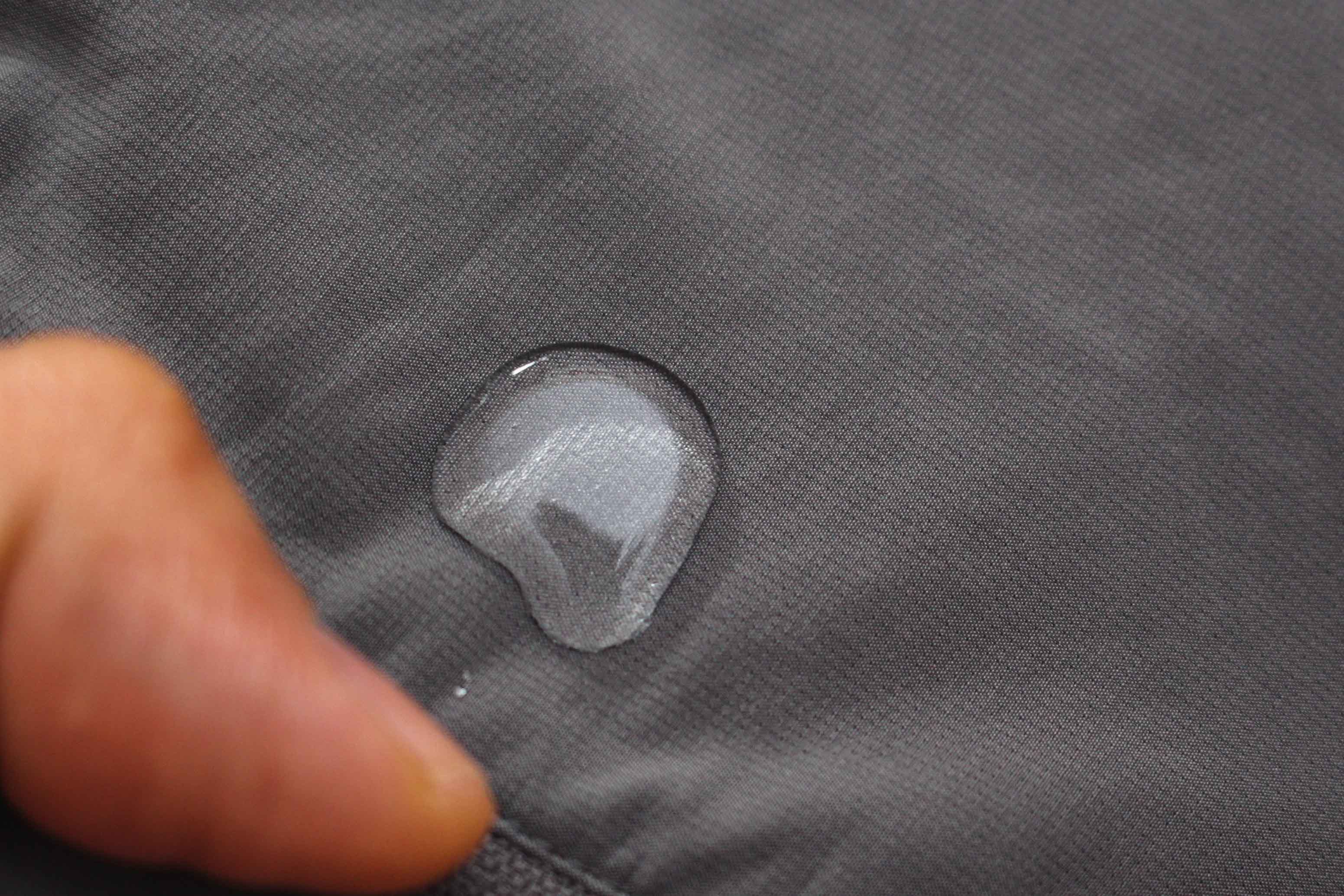 衣服面料还通过含氟原液浸轧处理,面料具备杜邦防泼溅效果,不止能够做到防雨滴,还具有防尘灰、防油污的功效。实测水滴滴在衣服上会有像荷叶上水珠自然流动的效果。