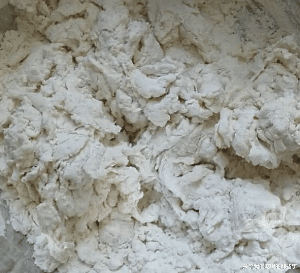 盆中加入五百克面粉,将酵母水倒进去,一边倒一边搅拌,盆内变成面絮状。