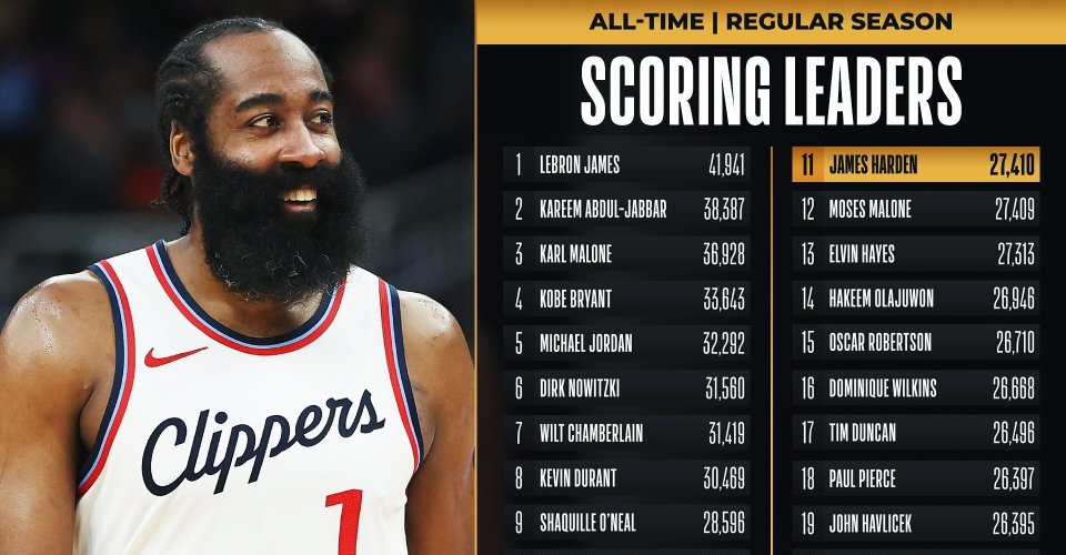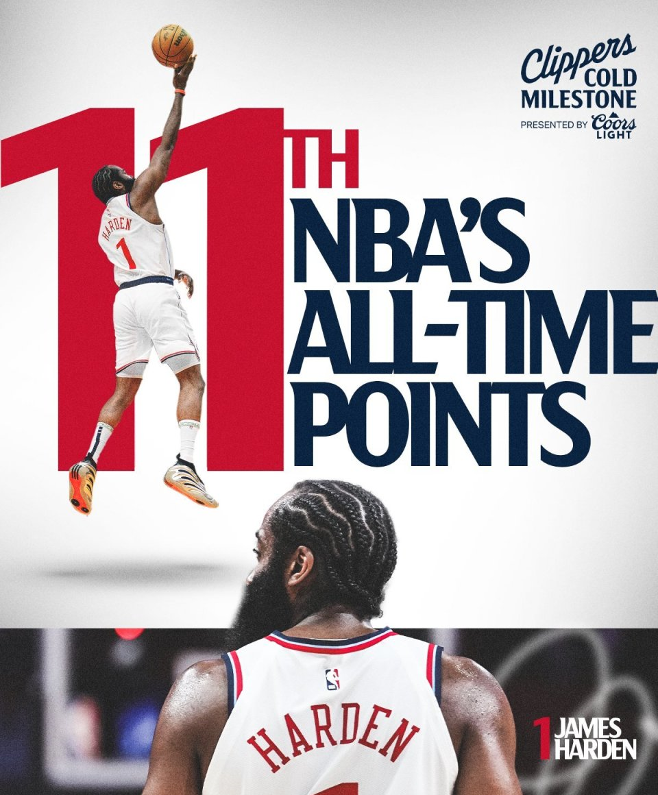 北京时间3月24日,快船主场迎战西部第一的雷霆,哈登在这场比赛中迎来职业生涯的里程碑时刻。他的常规赛总得分超越传奇中锋摩西-马龙,升至NBA历史得分榜第11位,现役球员中仅次于詹姆斯和杜兰特。