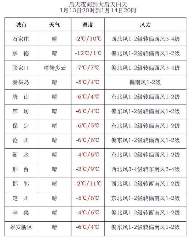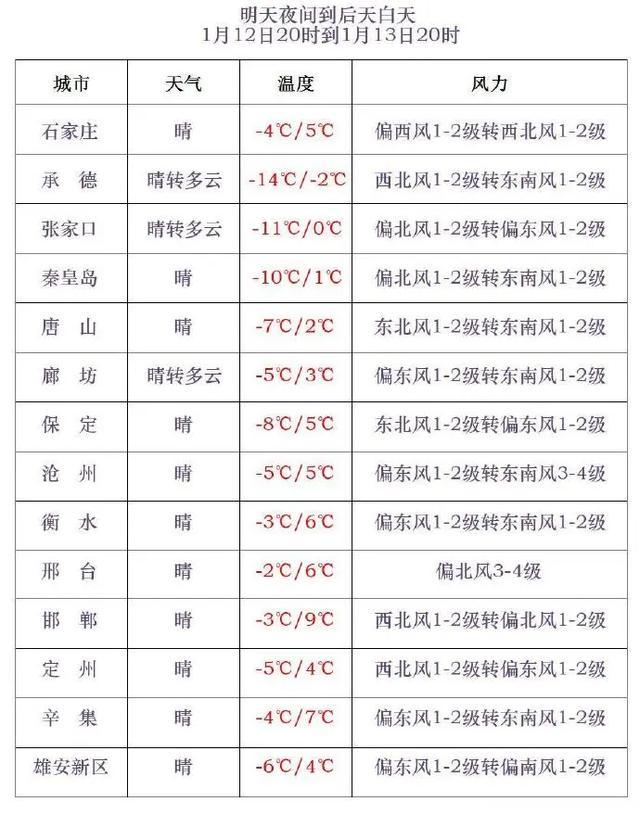 今天傍晚到夜间,全省晴间多云。最低气温,张家口、承德、秦皇岛北部、保定西北部-24~-11℃,其他地区-10~-2℃。