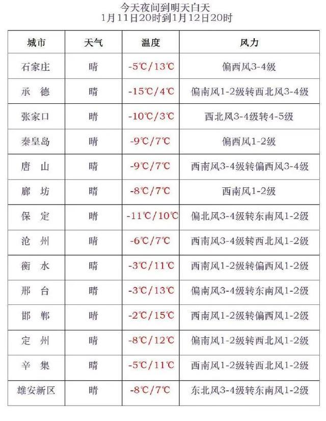 河北省气象台1月11日17时发布天气预报: