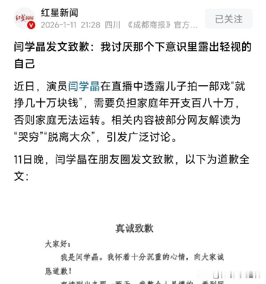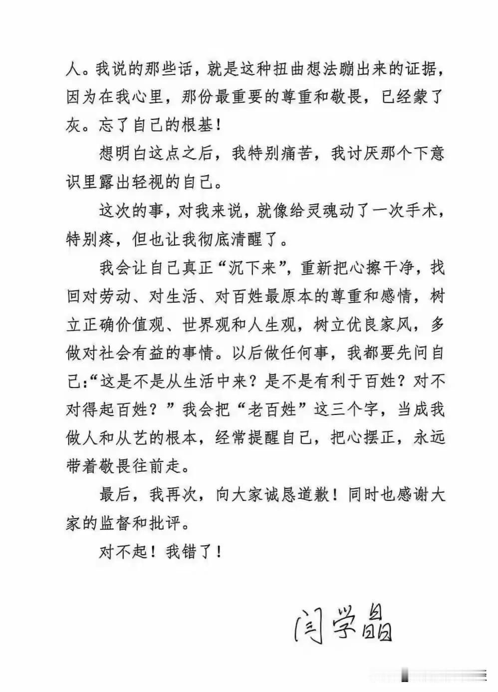 难得,闫学晶的道歉信来了。说她说了一些不该说的话,给大家带来了不愉快的体验。她说她错了,她被网友给骂醒了,希望大家能够体谅他,原谅她。她还是向大家低了头,前几天她还说她不是怂的人。那咋地,不认识我能咋滴,现在怎么忽然间给大家发来了致歉信,你接受吗?