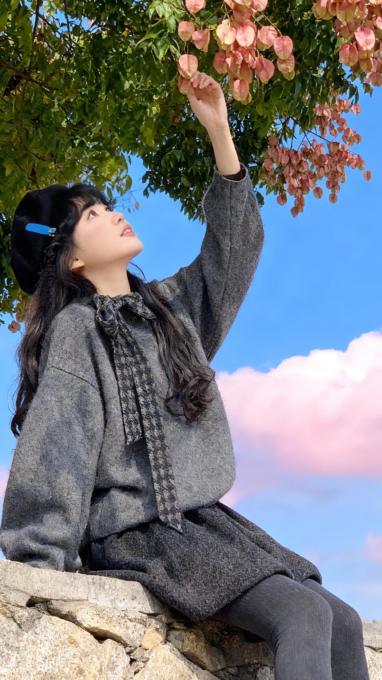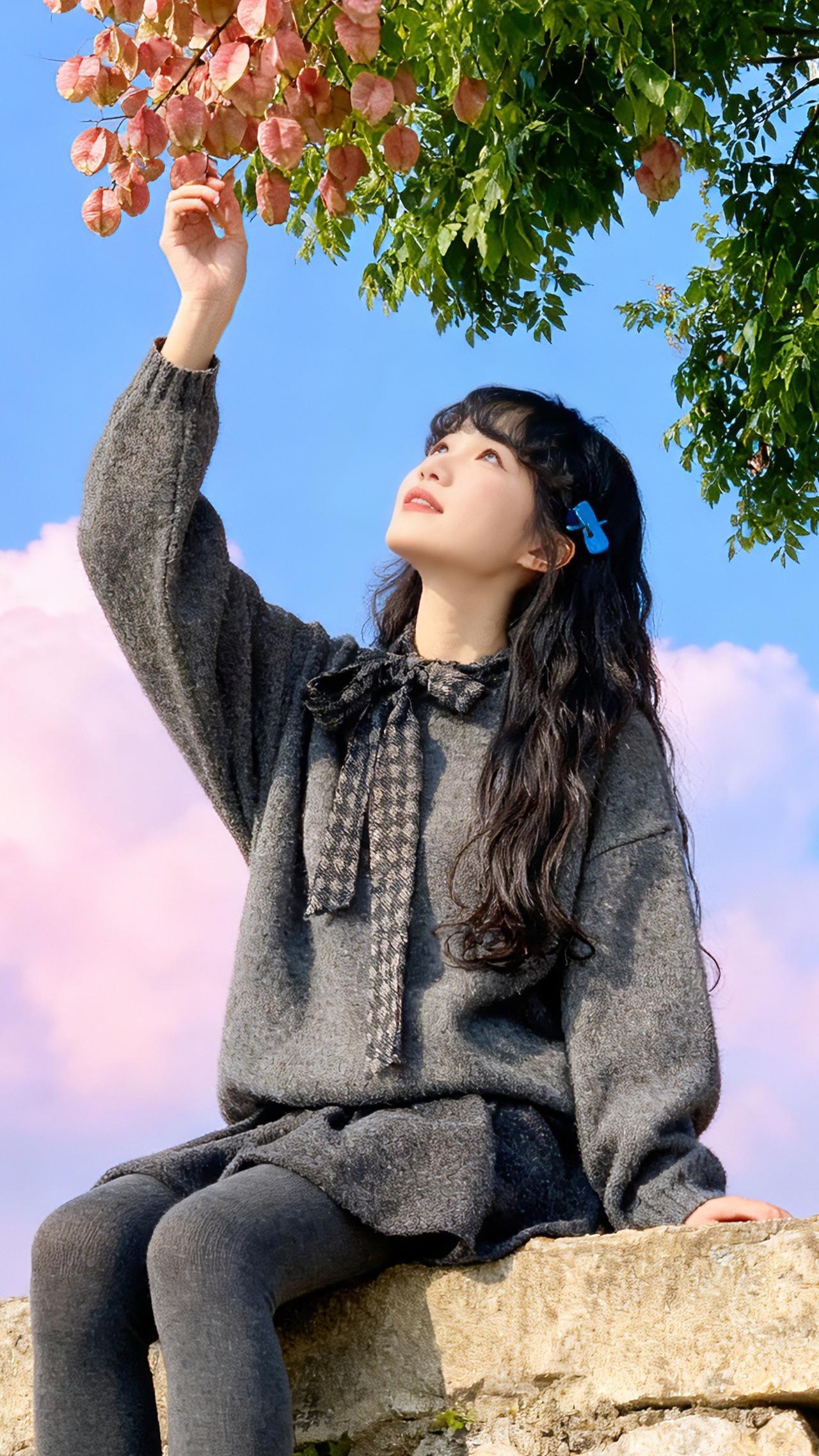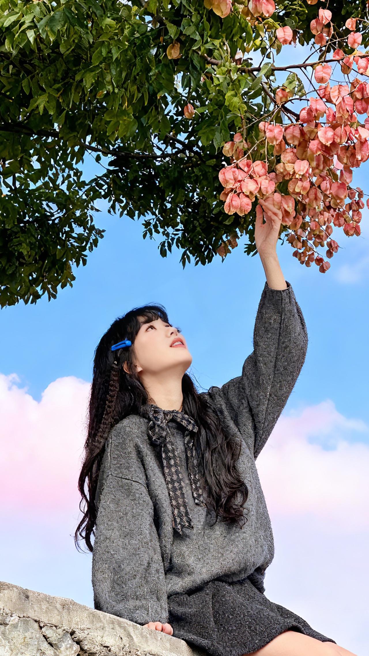 简约版型勾勒灵动身姿,柔和色调衬出亚裔女孩的温婉元气。 抬手触碰粉蒴果的瞬间,风