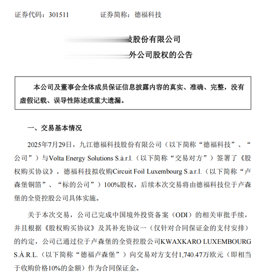 回溯来看,2025年7月29日晚,德福科技披露称,公司与VoltaEnergySolutionsS.à.r.l(以下简称“卖方”)签署了《股权购买协议》,德福科技拟收购卖方旗下卢森堡铜箔100%股权,标的公司100%企业价值为2.15亿欧元,扣除双方约定的调整项目后,计算得到标的公司100%股权收购价格为1.74亿欧元。