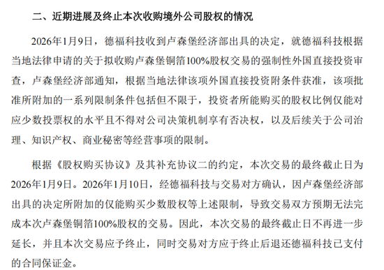 根据此前《股权购买协议》及其补充协议二的约定,本次交易的最终截止日为2026年1月9日。1月10日,经德福科技与交易对方确认,因卢森堡经济部出具的决定所附加的仅能购买少数股权等上述限制,导致交易双方预期无法完成本次卢森堡铜箔100%股权的交易。