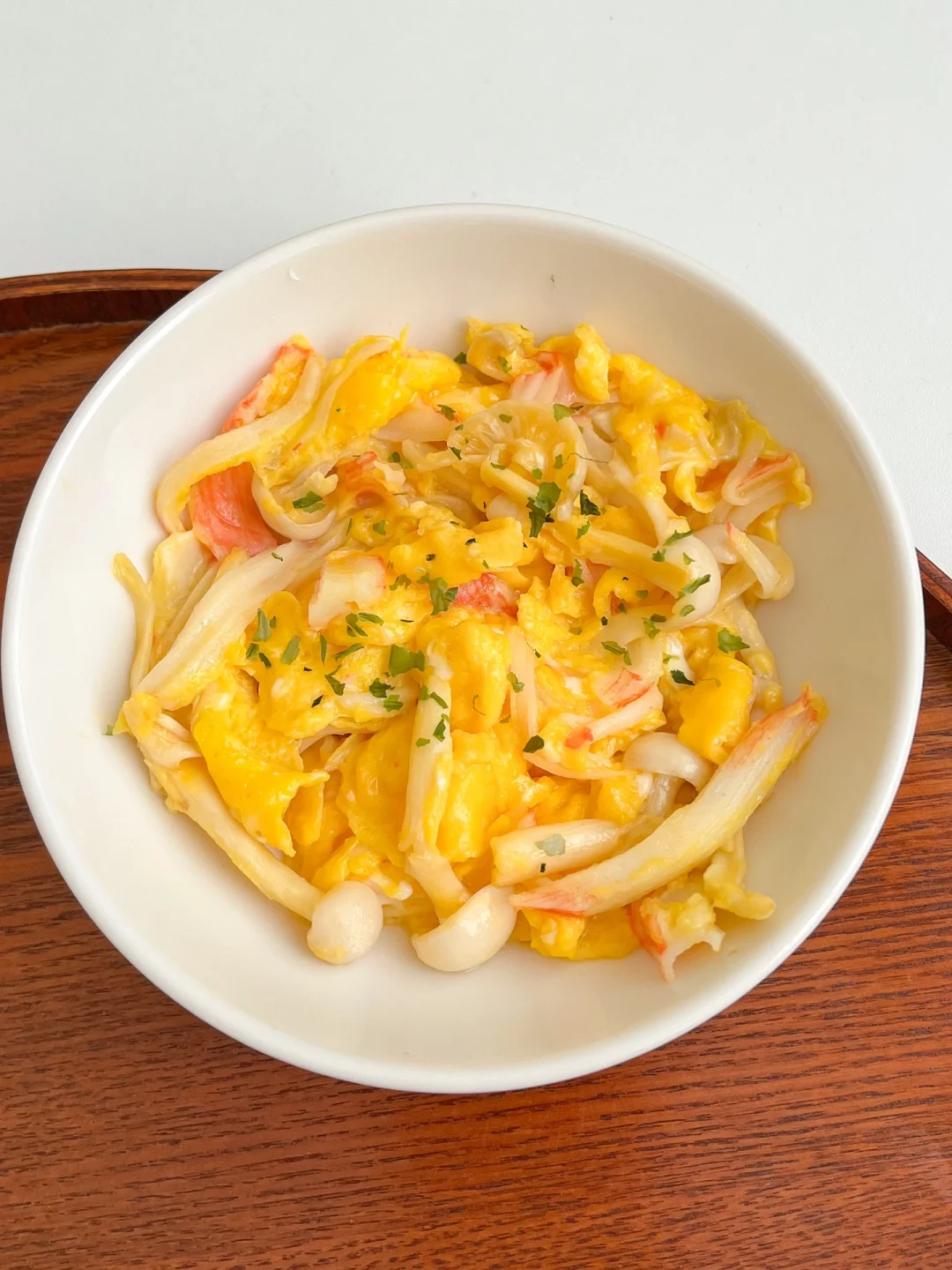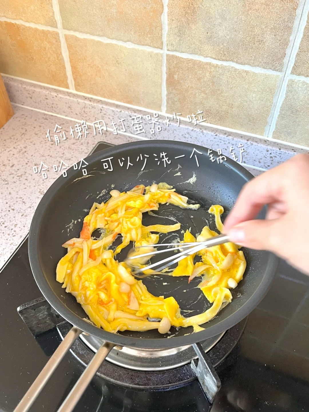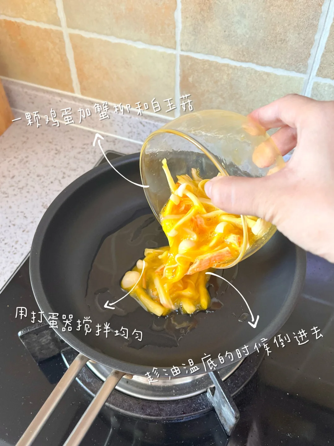 我也是第一次在滑蛋里面加小玉菇,滑溜溜意外的好吃!在打蛋液的时候就只放了盐调味,做滑蛋要在锅不太热的时候就倒进去,唰唰唰快速搅匀,微微凝固就要关火了,锅里还有余温,不然蛋就容易炒老