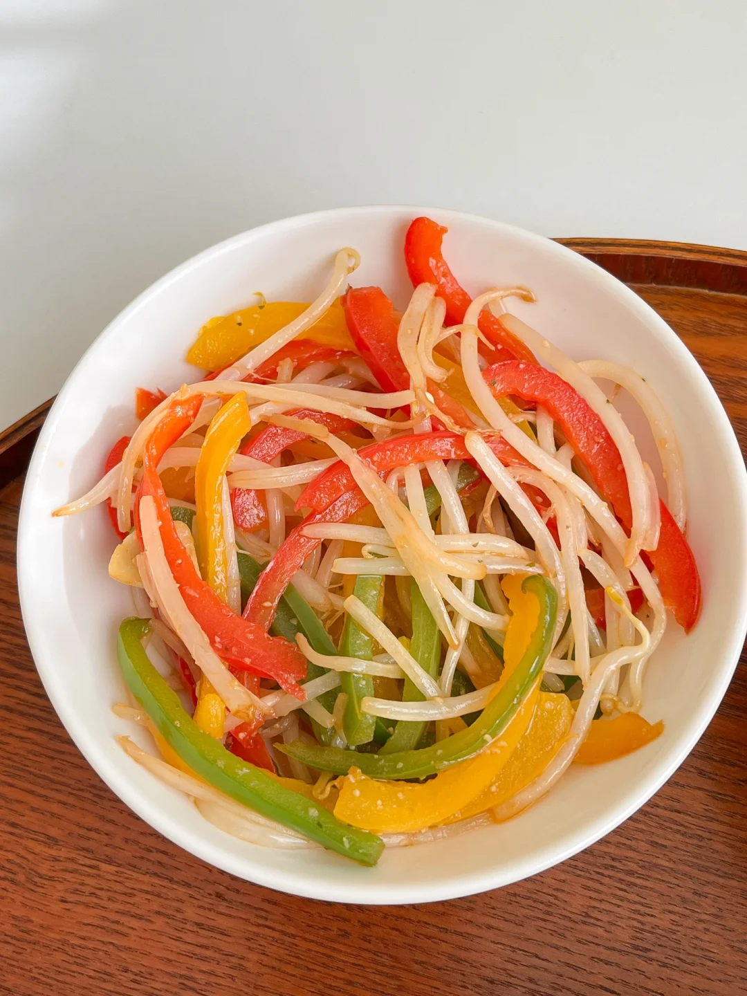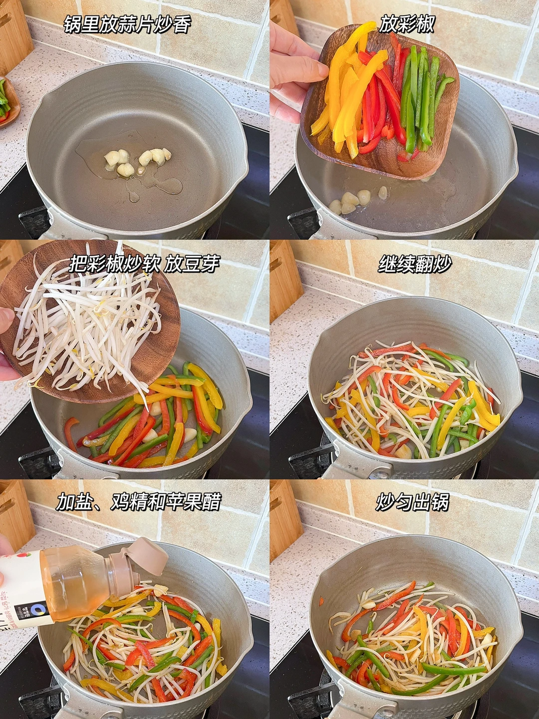 彩椒切开真不太容易存放,还够吃最后一顿的,和新买的豆芽炒一炒,脆生生的很好吃。我喜欢炒豆芽的时候临出锅前放点醋,苹果醋或白醋、米醋都可以,带点微酸很清爽。